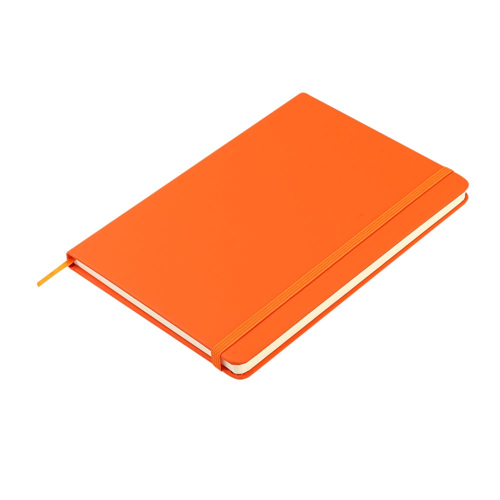 Блокнот формата А5 с твердым покрытием из PU-материала с имитацией рисунка кожи, с эластичной застежкой для закрытия и текстильной закладкой в цвет блокнота, 192 страницы / 96 листов, плотность 70г/м, страницы с черными линиями. Цвет по PANTONE® (максимально приближен): 166C.