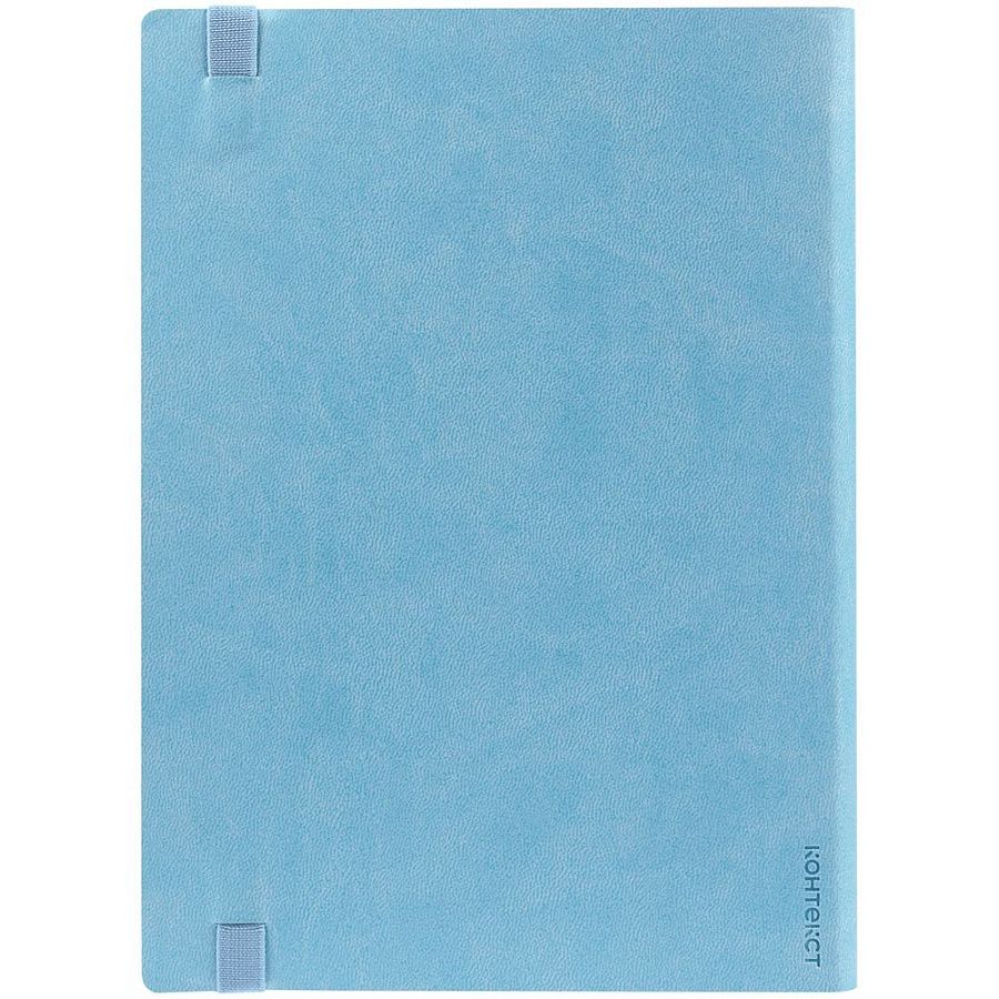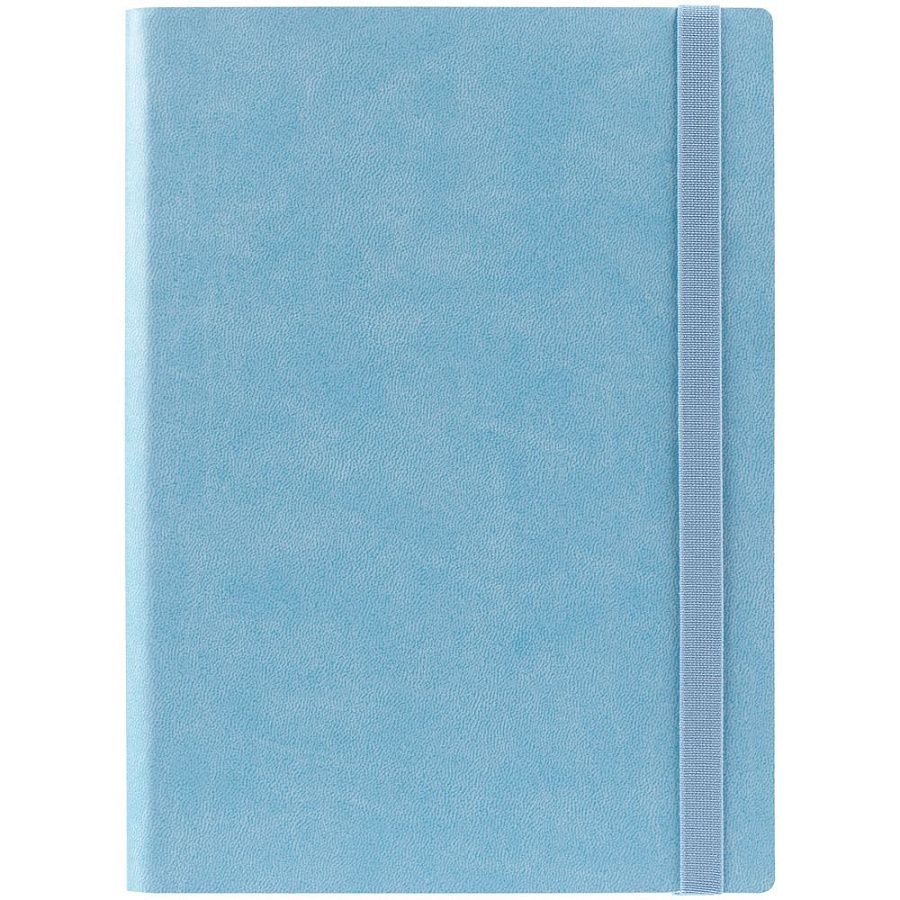Ежедневник с гибкой обложкой выполнен из материала Latte, голубой JJ, и дополнен резинкой шириной 1 см, капталом и ляссе голубого цвета.