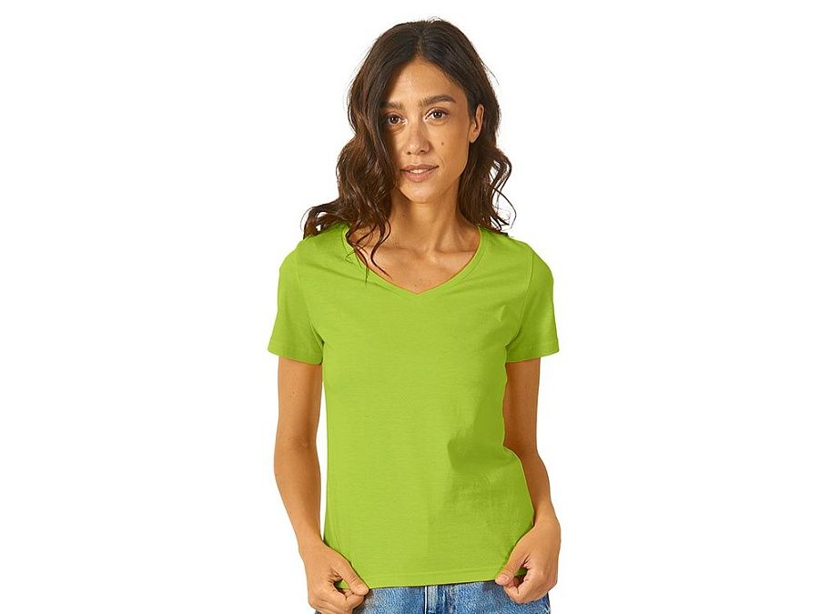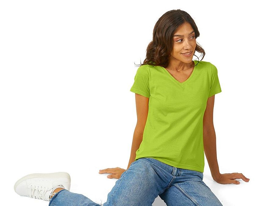 Женская футболка из натурального хлопка с элегантным V-образным вырезом. Материал отлично подходит для нанесения рекламной информации. Натуральная ткань не вызывает раздражения кожи.
