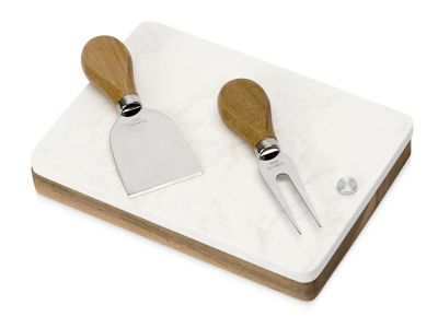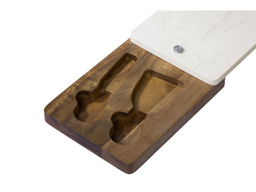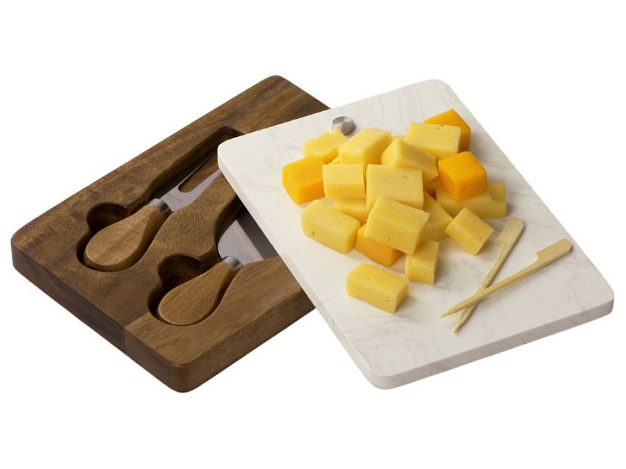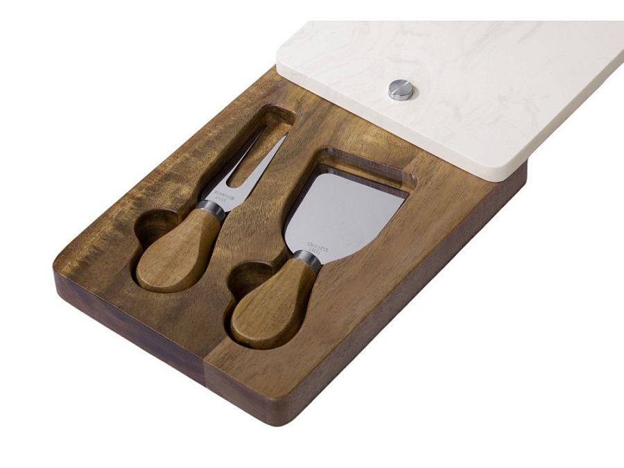 Набор для сыра бренда Eat&Bite Select состоит из ножа и вилки в футляре. Высококачественные материалы — акация и искусственный мрамор — обеспечивают набору долгую жизнь и благородный внешний вид. Крышка футляра, выполненная из белого мрамора, благодаря своей твердости может использоваться как разделочная доска, а благородный внешний вид делает ее идеальным вариантом для сервировки сыров и закусок.