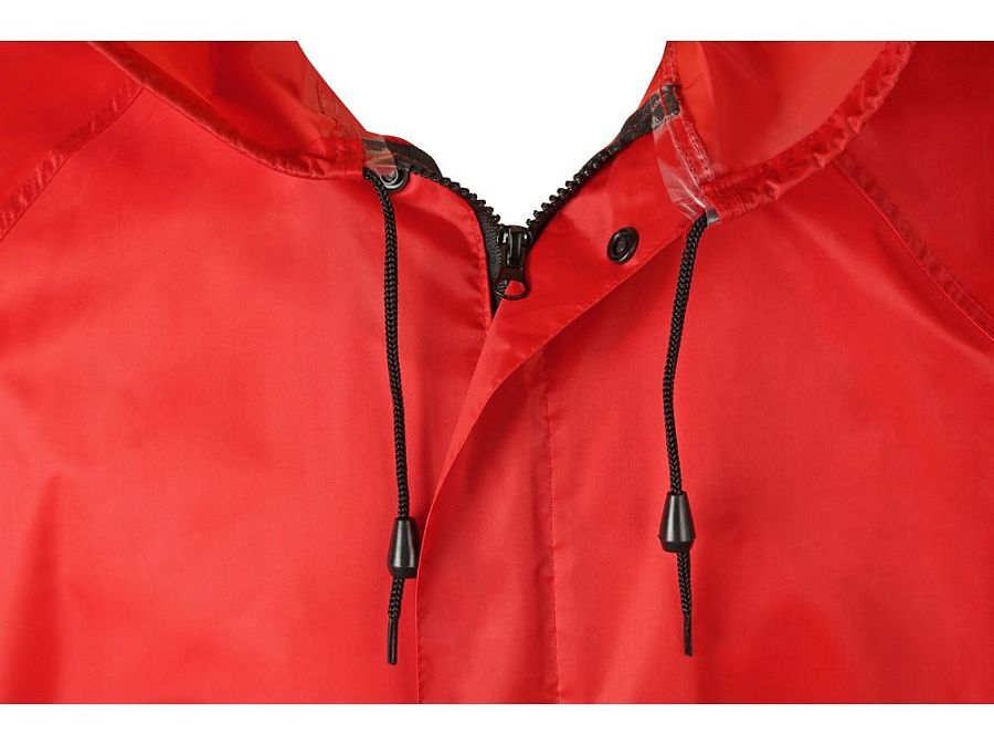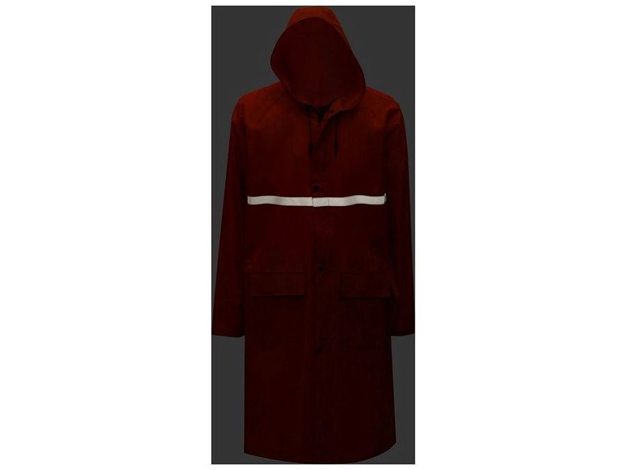 Длинный дождевик выполнен из полиэстера с водоотталкивающей пропиткой. Застегивается на молнию, поверх которой — планка на кнопках, что дополнительно защищает от ветра и промокания. Посадку капюшона можно регулировать при помощи шнурка, ширина рукава регулируется кнопкой.