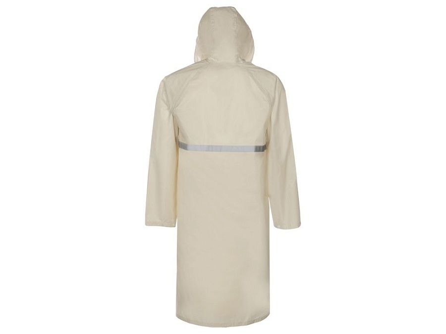 Длинный дождевик выполнен из полиэстера с водоотталкивающей пропиткой. Застегивается на молнию, поверх которой — планка на кнопках, что дополнительно защищает от ветра и промокания. Посадку капюшона можно регулировать при помощи шнурка, ширина рукава регулируется кнопкой.