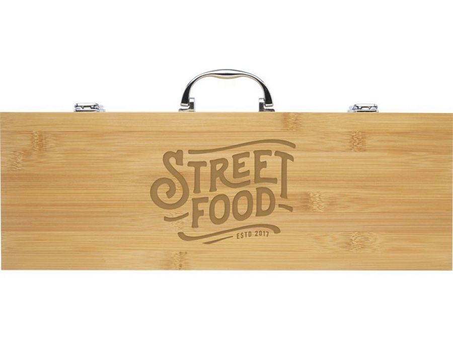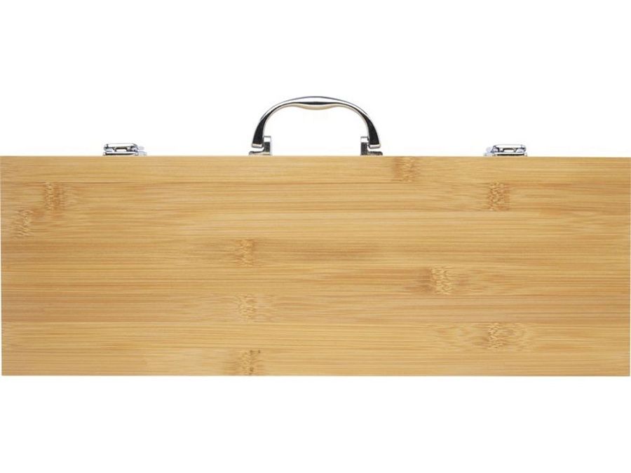 Набор для барбекю из 5 предметов из бамбука: лопатка (40 x 9,5 см), щипцы (34,5 x 6 см), вилка (38,5 x 3 см), нож (38,5 x 3 см) и щетка (38 x 4,3 см). Набор поставляется в подарочной коробке из бамбука (46 x 16,2 x 7,4 см). Ручки и подарочная коробка изготовлены из бамбука, который производится в соответствии со стандартами устойчивого развития.