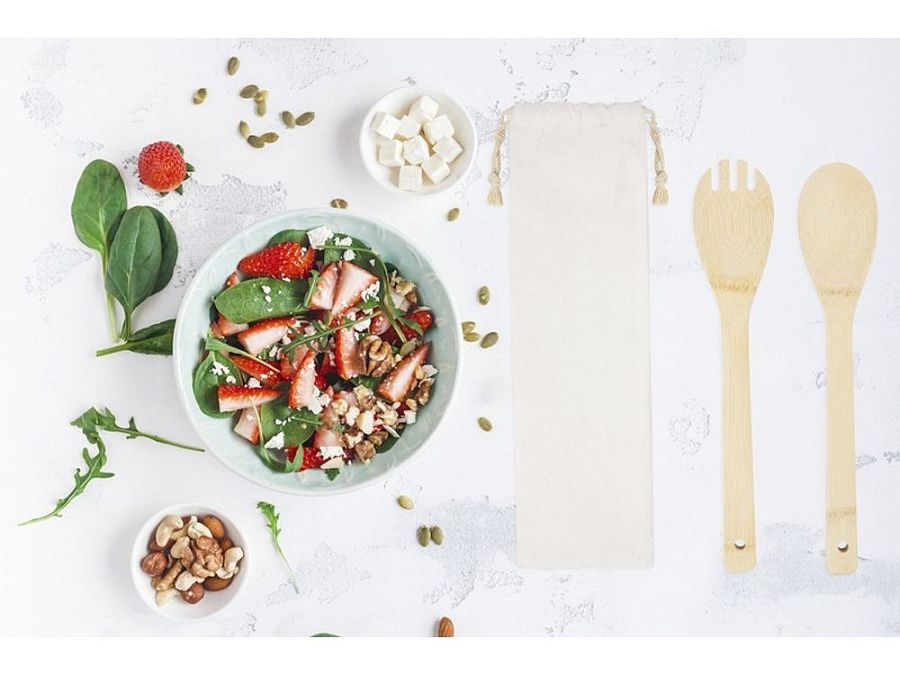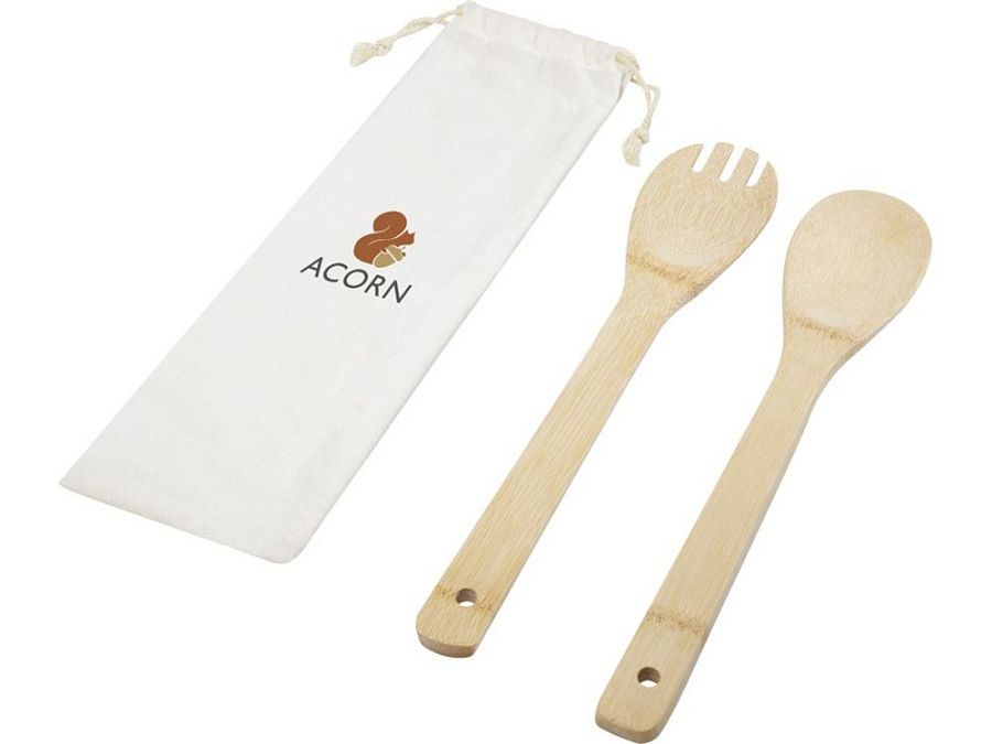 Бамбуковый комплект из салатной ложки и вилки, удобный для повседневных семейных ужинов. Используемый бамбук поставляется и производится в соответствии со стандартами устойчивого развития.