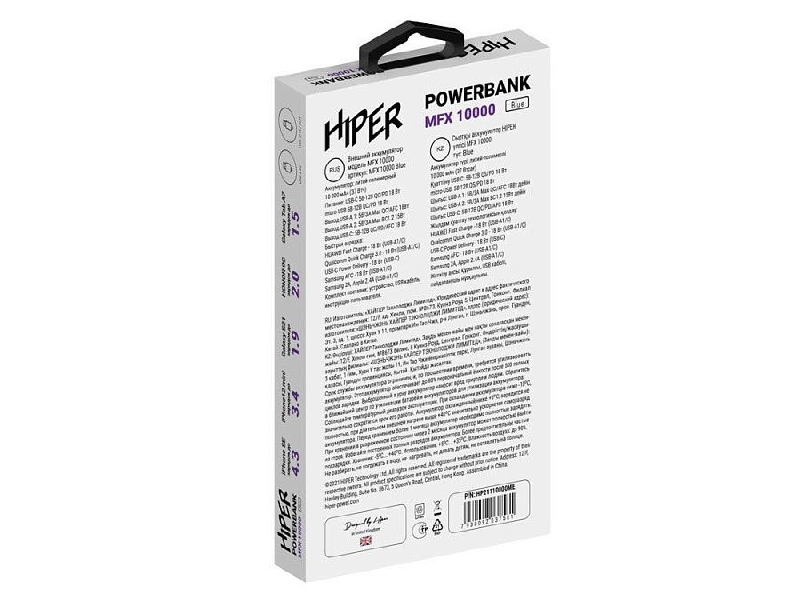 Портативный внешний аккумулятор HIPER MFX 10000 емкостью 10000 мАч (37Втч) оснащён двунаправленным портом USB-C, Micro-USB входом для зарядки, с поддержкой быстрой зарядки аккумулятора QC и PD, 2xUSB-A выходами, максимальный выходной ток 3.0А, максимальная мощность 18 Вт, поддержка быстрой зарядки стандарта QC 18 Вт, поддержка быстрой зарядки стандарта PD 18 Вт.