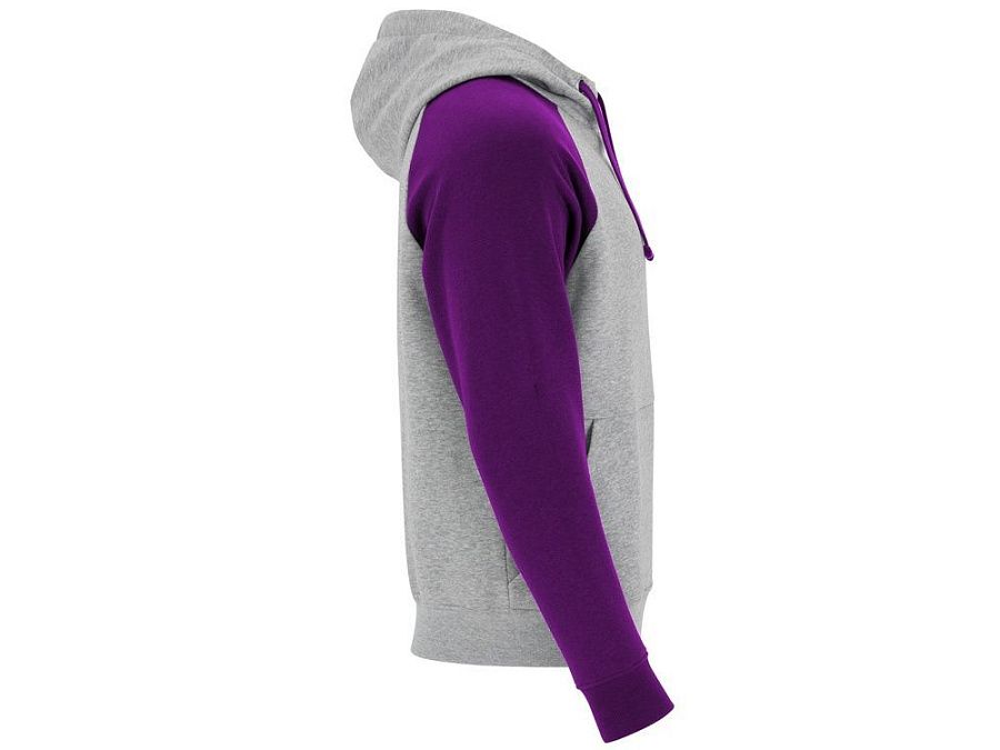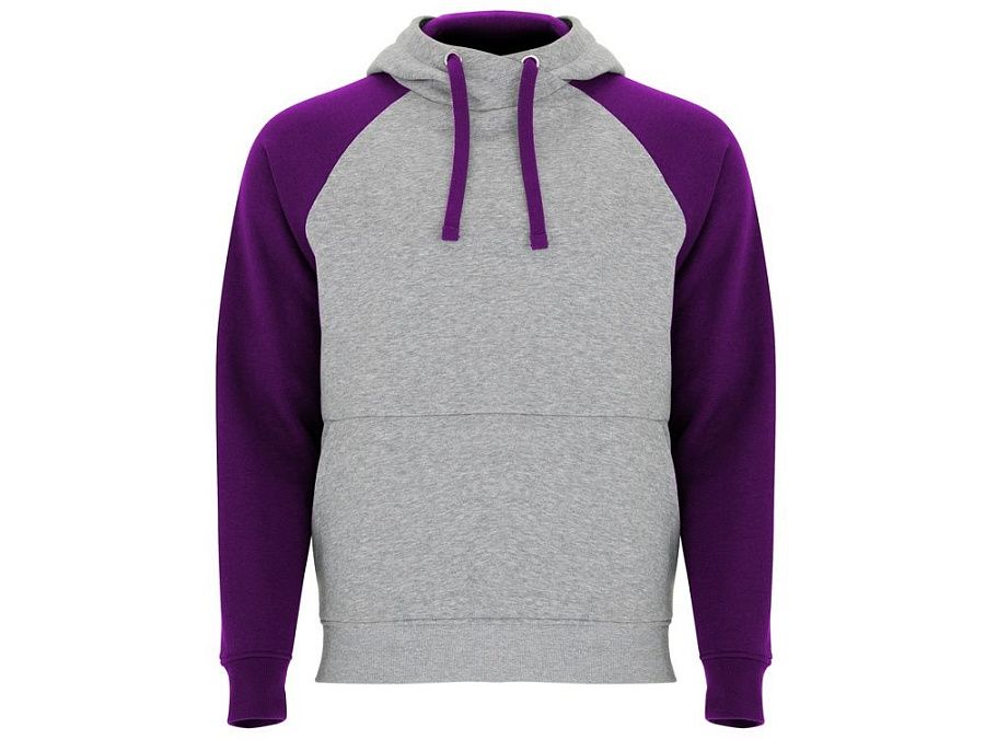 Худи с контрастным рукавом реглан. Капюшон с запахом, с контрастной подкладкой и шнурком. На полочке карман кенгуру. Манжеты рукавов и низ изделия из риба 1х1.
