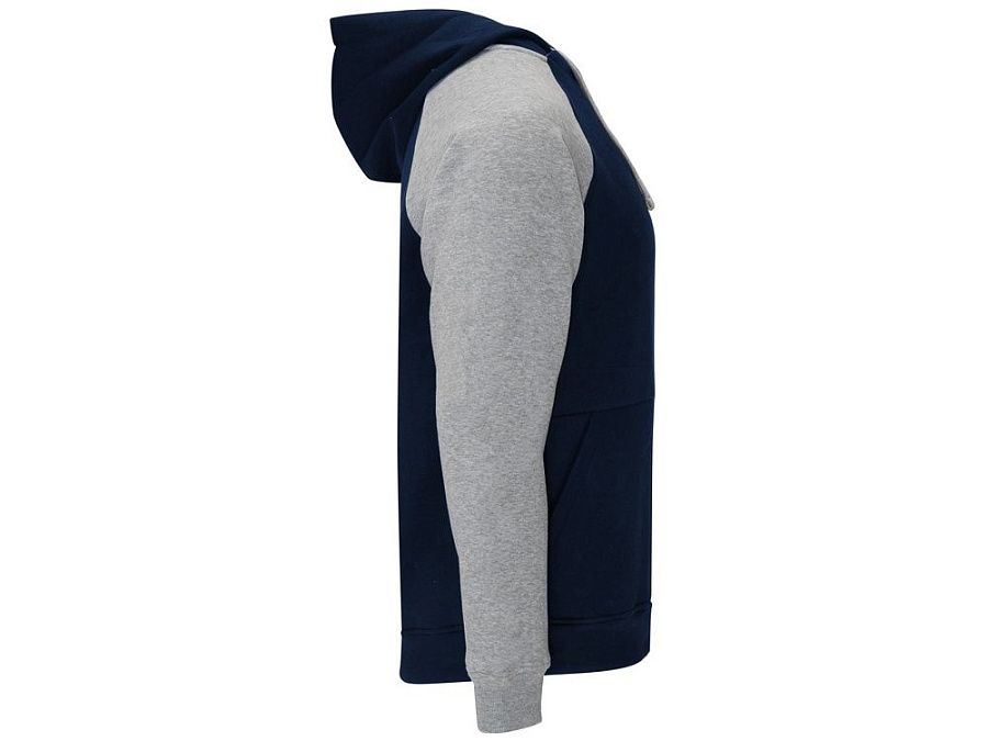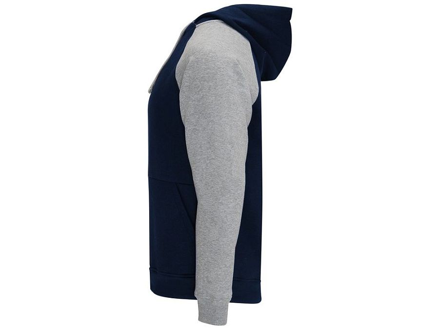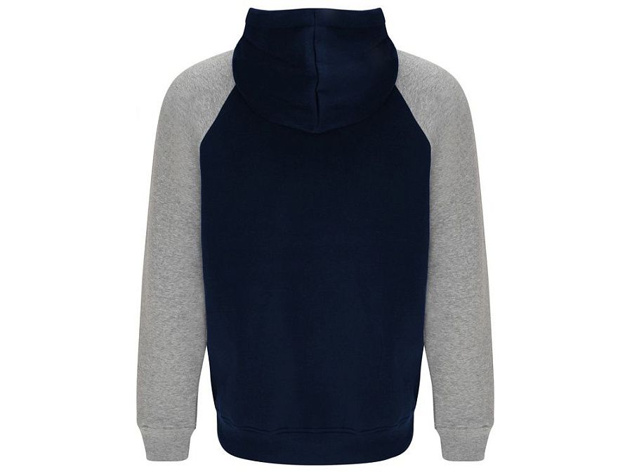 Худи с контрастным рукавом реглан. Капюшон с запахом, с контрастной подкладкой и шнурком. На полочке карман кенгуру. Манжеты рукавов и низ изделия из риба 1х1.