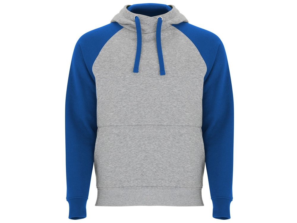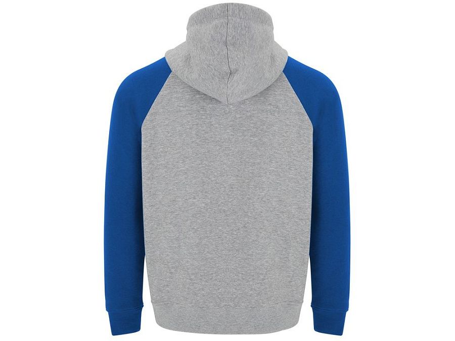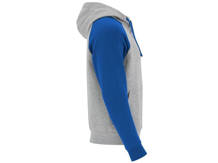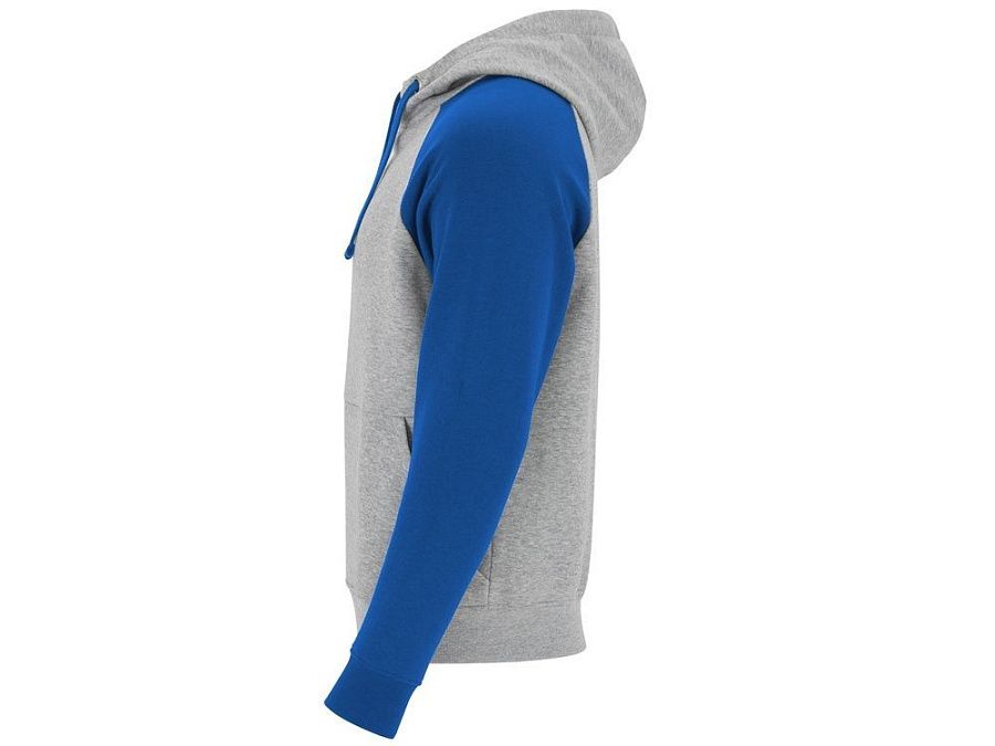 Худи с контрастным рукавом реглан. Капюшон с запахом, с контрастной подкладкой и шнурком. На полочке карман кенгуру. Манжеты рукавов и низ изделия из риба 1х1.