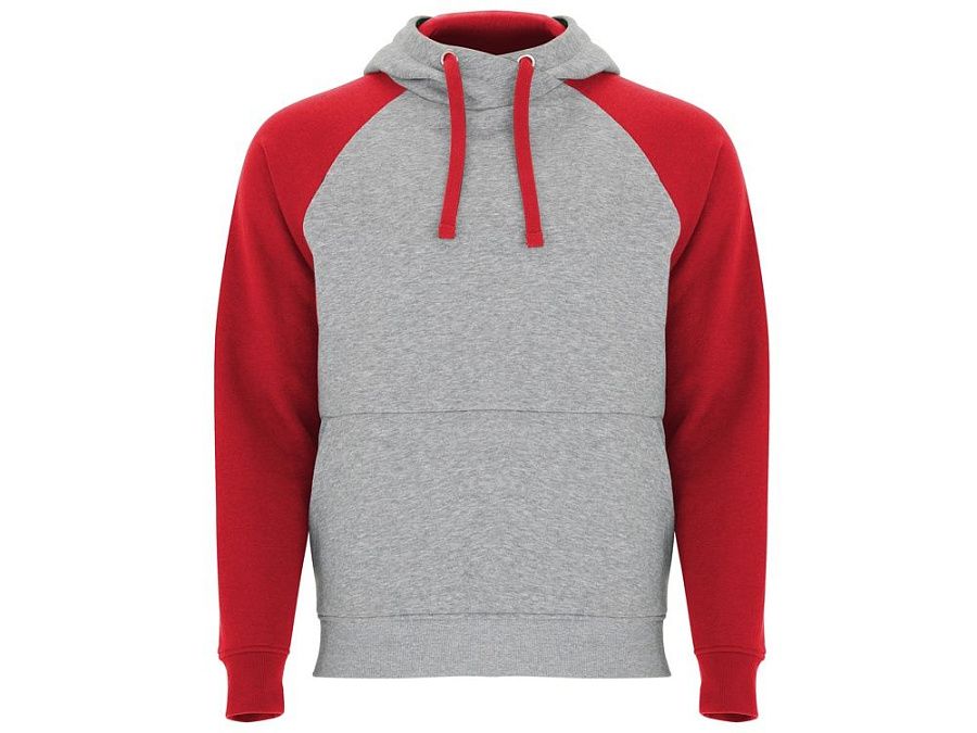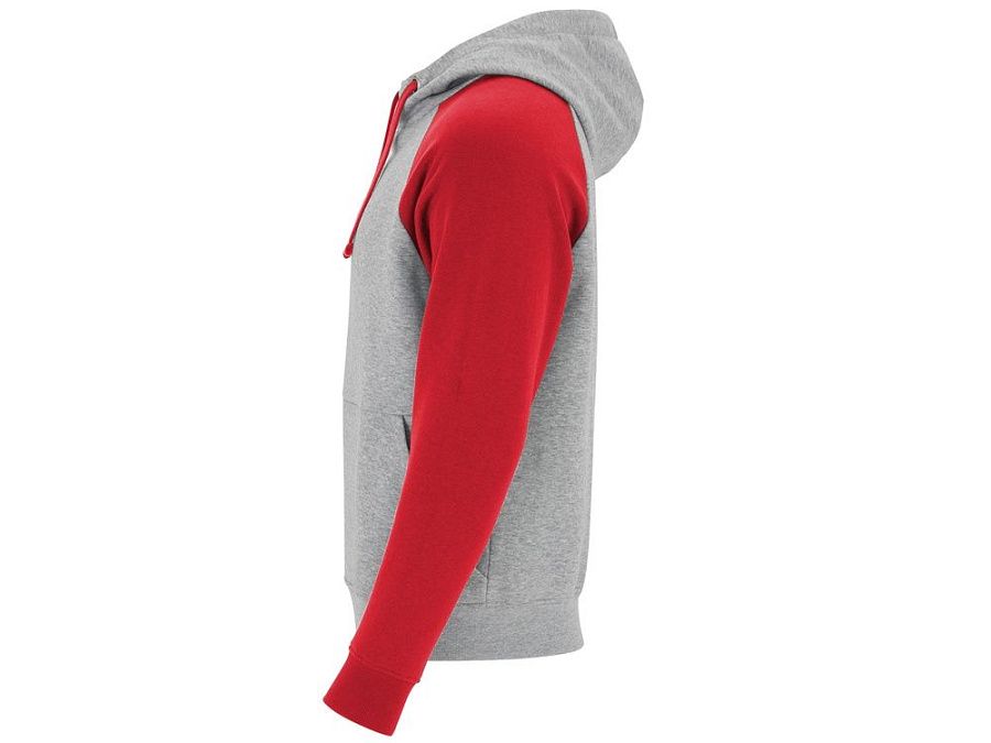 Худи с контрастным рукавом реглан. Капюшон с запахом, с контрастной подкладкой и шнурком. На полочке карман кенгуру. Манжеты рукавов и низ изделия из риба 1х1.