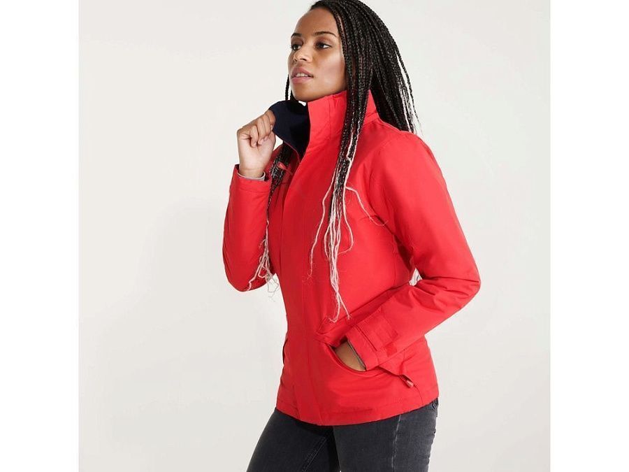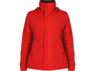 Парка прилегающего силуэта с высоким воротом застегивается на молнию в тон: