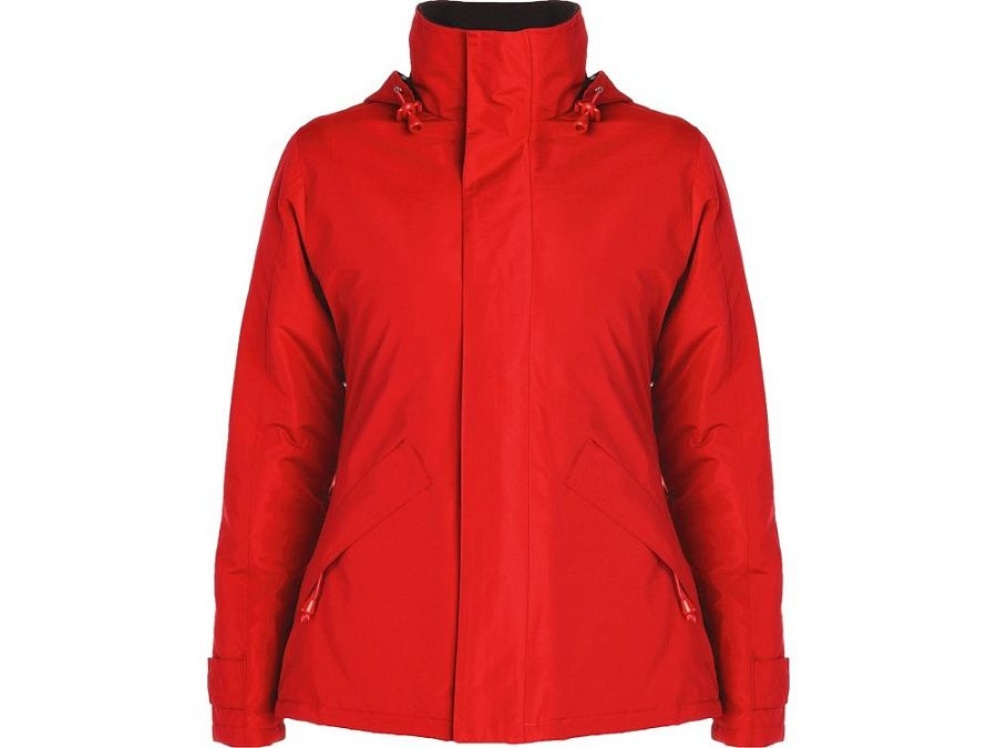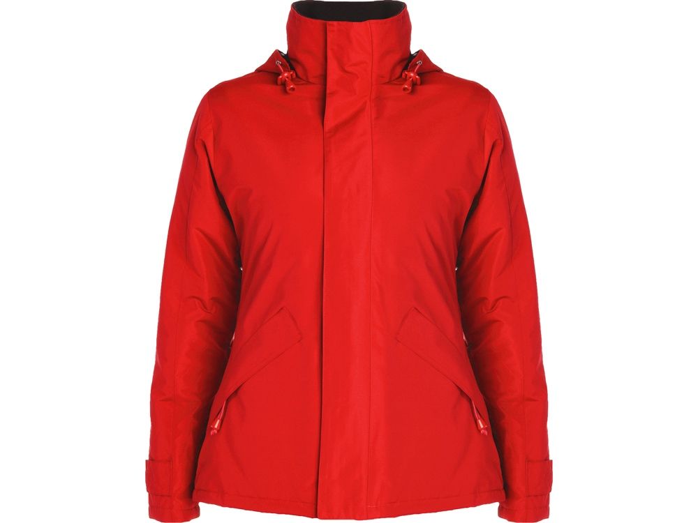 Парка прилегающего силуэта с высоким воротом застегивается на молнию в тон: