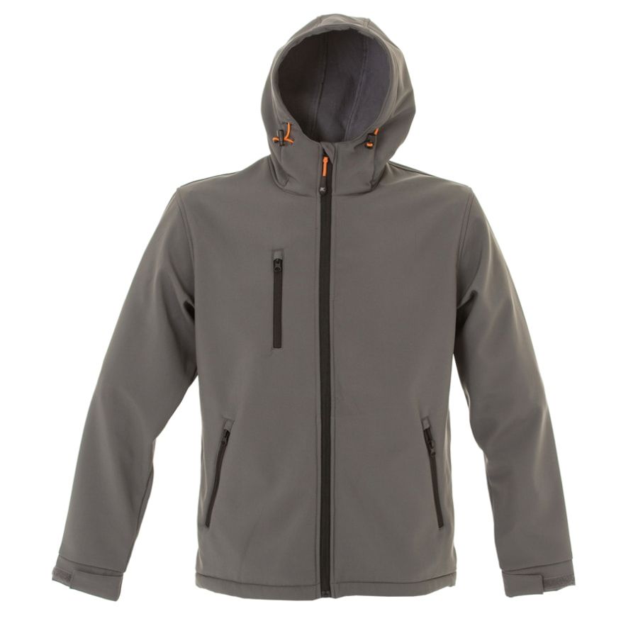 Ткань softshell. Водонепроницаемая и дышащая двухслойная куртка. Обратная облегченная пластиковая молния со съемным пуллером. Один нагрудный и два боковых кармана на молнии. Утягивающий шнурок по низу куртки. Регулируемые манжеты на липучке.