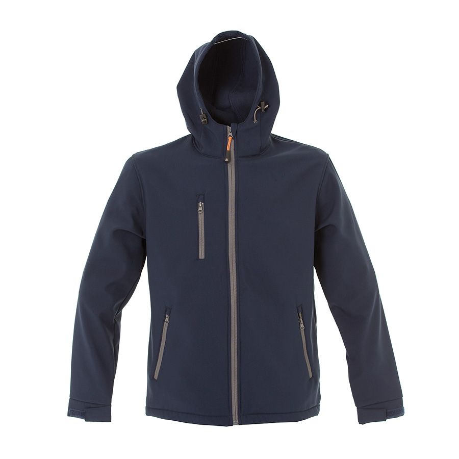 Основная ткань: цвет, близкий к Pantone 2380 C, подкладка: цвет, близкий к Pantone 289 C Ткань softshell. Водонепроницаемая и дышащая двухслойная куртка. Обратная облегченная пластиковая молния со съемным пуллером. Один нагрудный и два боковых кармана на молнии. Утягивающий шнурок по низу куртки. Регулируемые манжеты на липучке.
