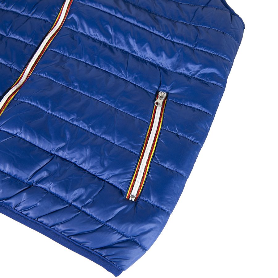 Легкий жилет из нейлона. Небольшой воротник-стойка. Контрастная облегленная пластиковая молния со съемным пуллером. Два передних кармана на молнии. Один внутренний карман на липучке. Cтягивающая эластичная резинка по низу изделия и в рукавах.