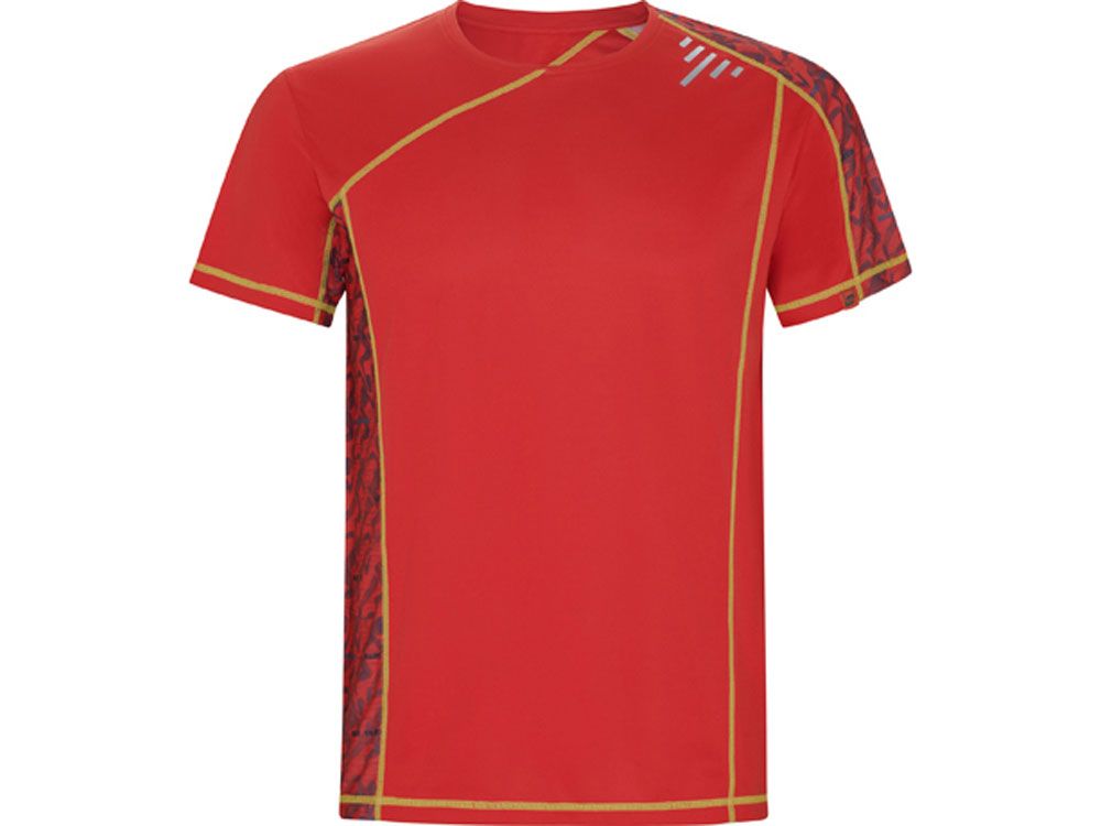 Спортивная футболка с коротким рукавом и принтованными вставками. Контрастные отстрочки плоским швом, светоотражающие элементы на полочке и спинке. Эко лейбл на рукаве.