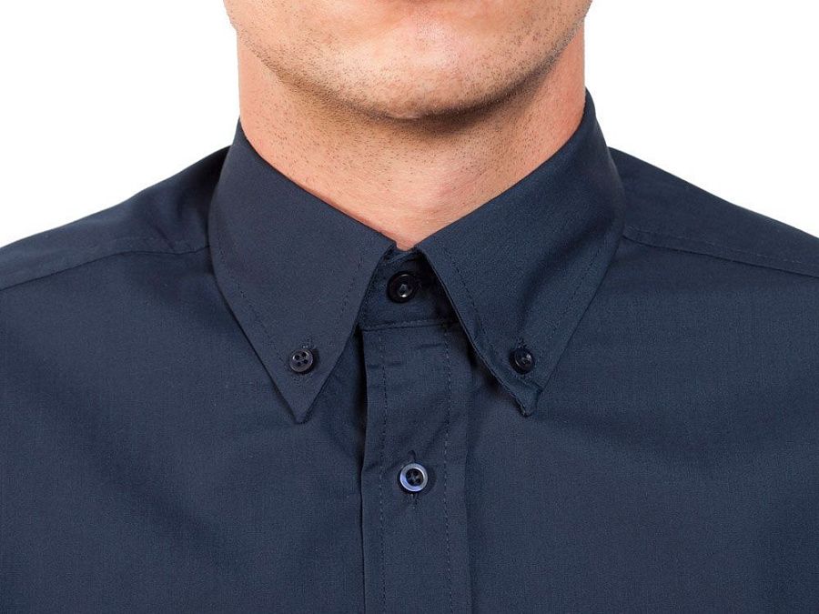 Рубашка мужская с длинным рукавом на семи пуговицах. Накладной карман на груди слева, закругленный низ изделия. Уголки воротника продублированы пуговицами.