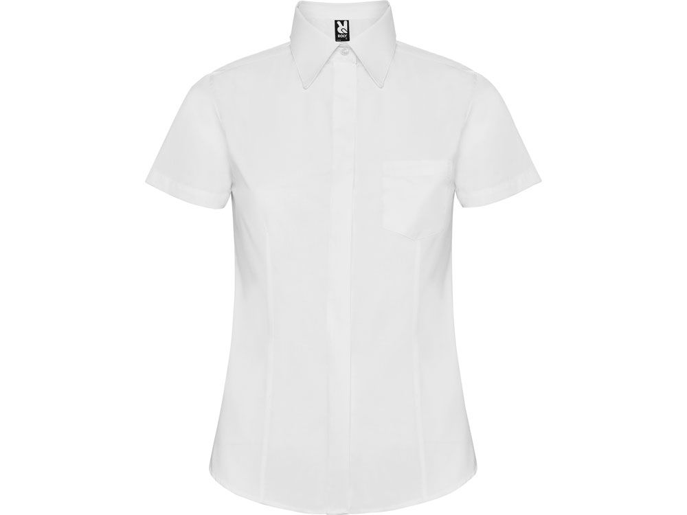 Рубашка женская прилегающего силуэта с вытачками на полочке и спинке с коротким рукавом. Накладной карман на груди слева, закругленный низ изделия. Планка с потайными пуговицами.