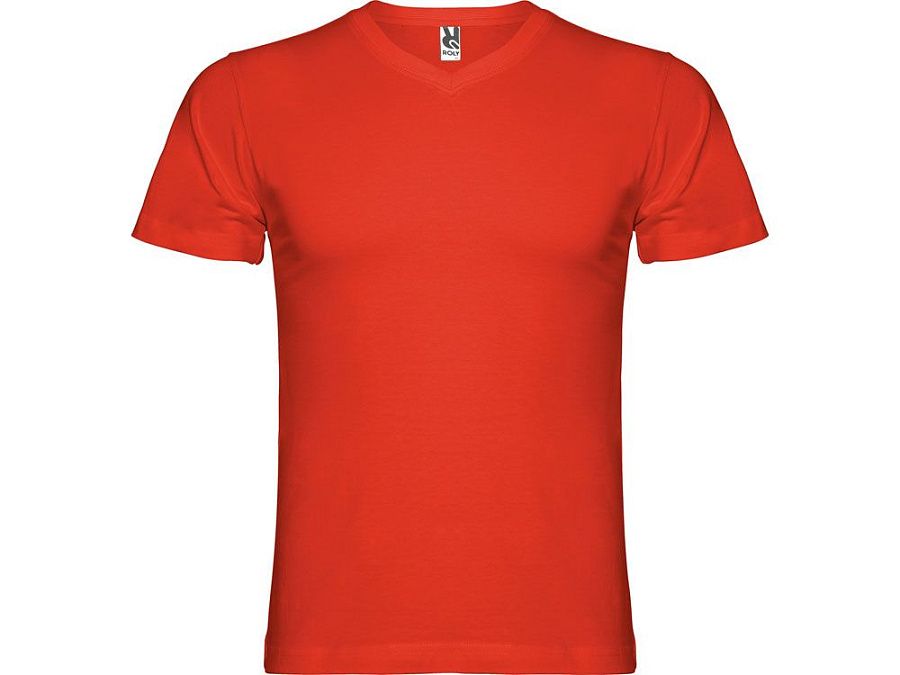 Мужская футболка без боковых швов с коротким рукавом и V-образным вырезом горловины, отделанном рибом 1х1. Горловина и плечевые швы дополнительно укреплены тесьмой.
