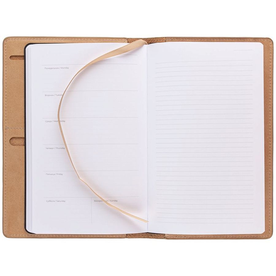 Еженедельник Remini со съемной обложкой-портфолио из натуральной кожи, репсовым ляссе и окрашенным срезом обложки в цвет материала.