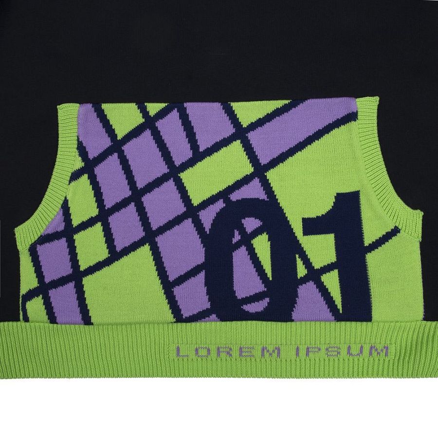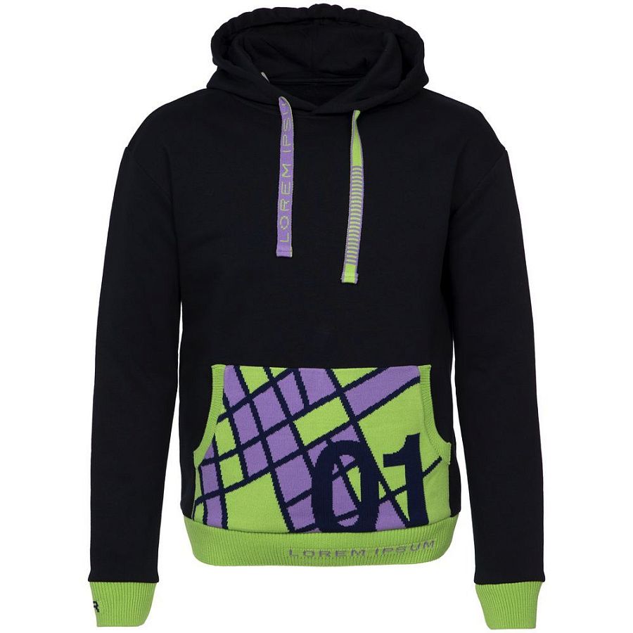 Карман-кенгуру с вывязанным логотипом или индивидуальным рисунком в фирменной цветовой гамме.