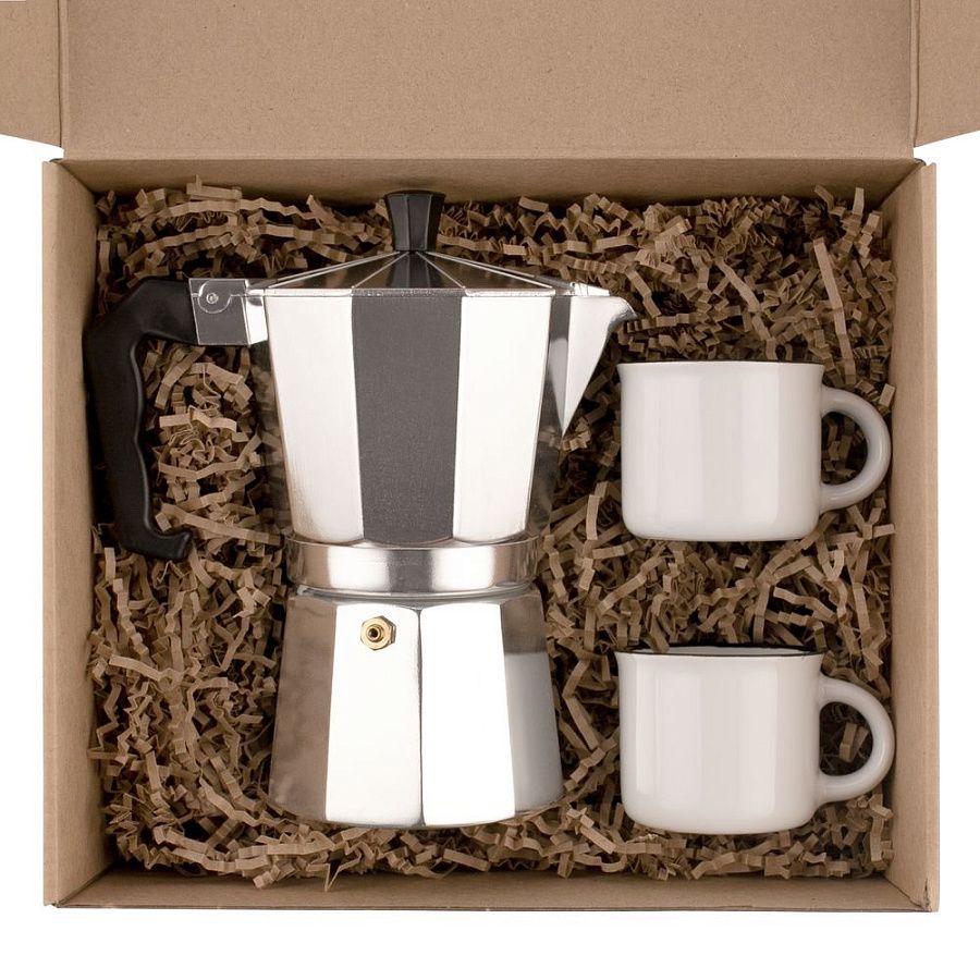кофеварка - алюминий, пластик; кружка - фаянс; коробка - микрогофрокартон
