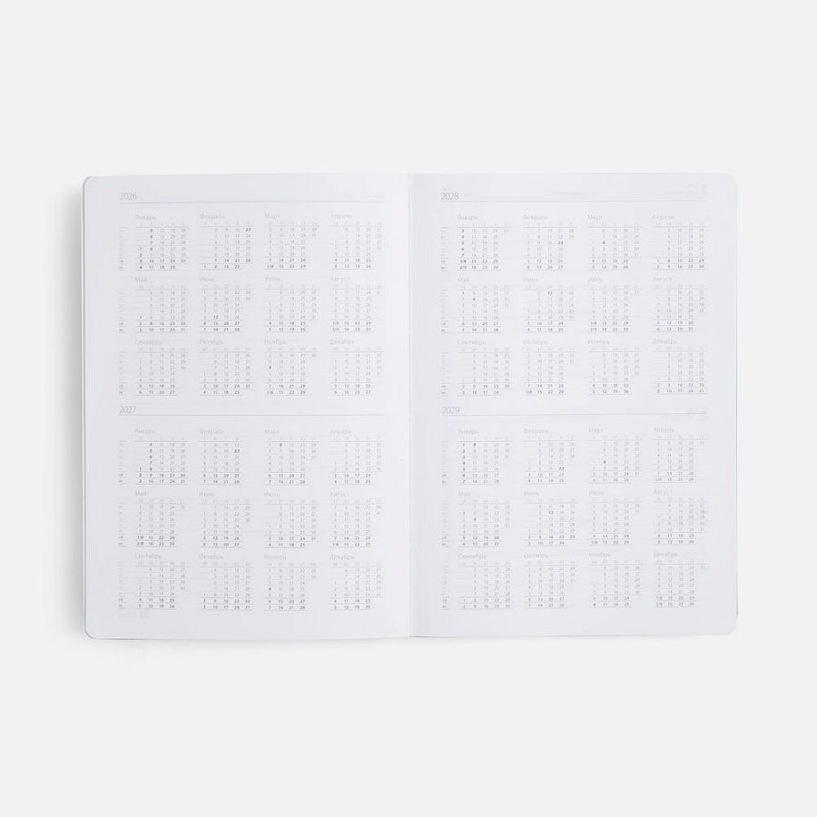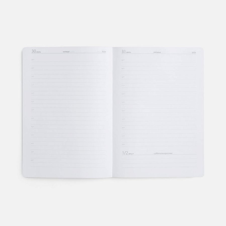 Ежедневник с полутвердой обложкой выполнен из материала Nice Touch, серый СС, и дополнен резинкой шириной 1 см с металлическим шильдом и ляссе серого цвета.