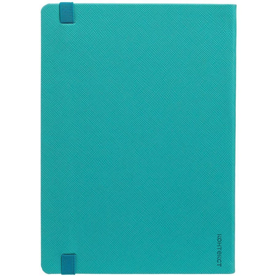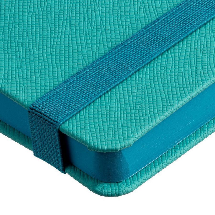 Ежедневник с полутвердой обложкой выполнен из материала Nice Touch, морская волна II, и дополнен резинкой шириной 1 см с металлическим шильдом и ляссе в цвет обложки.