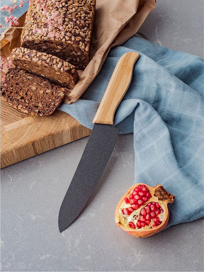 Нож Selva выполнен из керамики и бамбука. Широкий клинок имеет оптимальную форму и режущую кромку, которая не нуждается в заточке. Удобная анатомическая ручка ножа надежно лежит в руке, не скользит, практически не впитывает влагу.