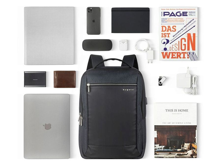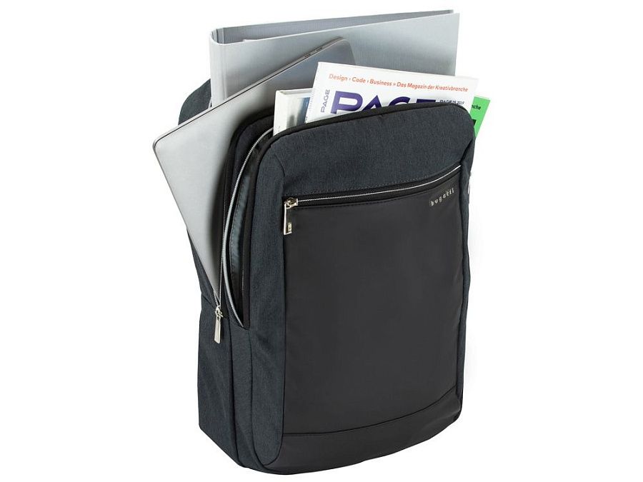 Внешняя организация: передний карман на молнии с защитой данных RFID, задний потайной карман на молнии, верхняя ручка высотой 6 см, ремень для соединения с телескопической ручкой чемодана, 2 мягких регулируемых плечевых ремня (до 85 см)