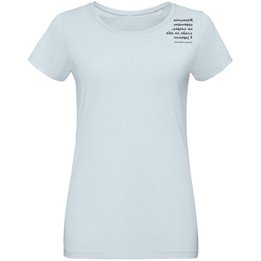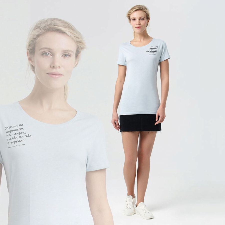 Цитата «Женщина хорошеет на глазах, глядя на себя в зеркало» отзеркалена, так что для окружающих она выглядит абракадаброй. Но стоит обладательнице футболки подойти к зеркалу, она увидит правильное написание. Тут и случится то самое волшебство, про которое написано на футболке.