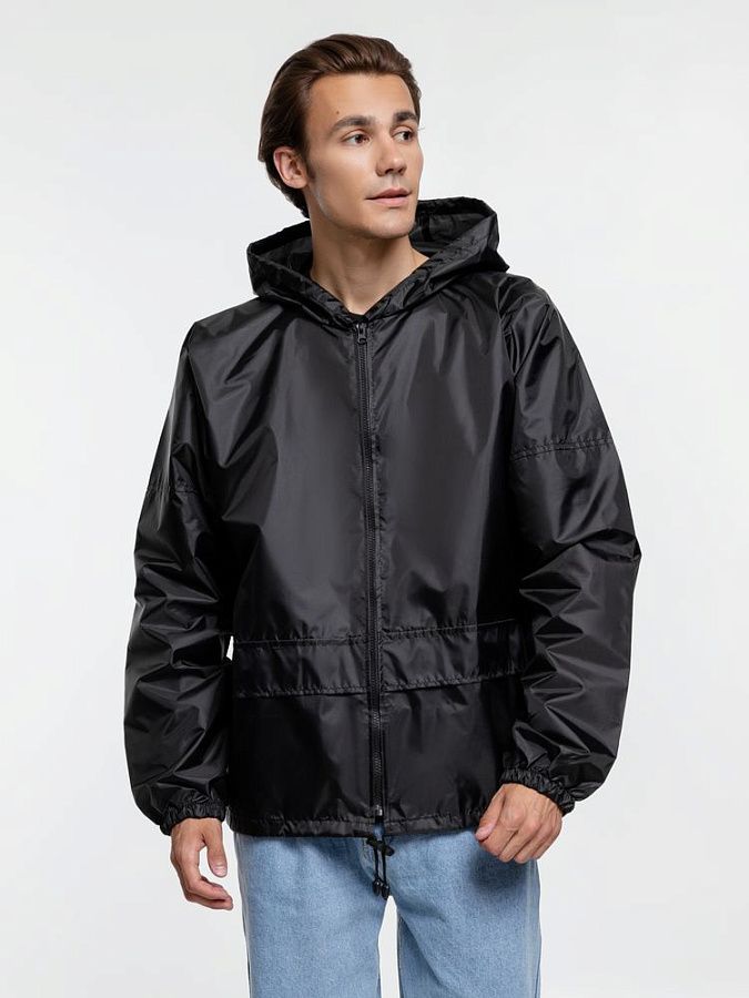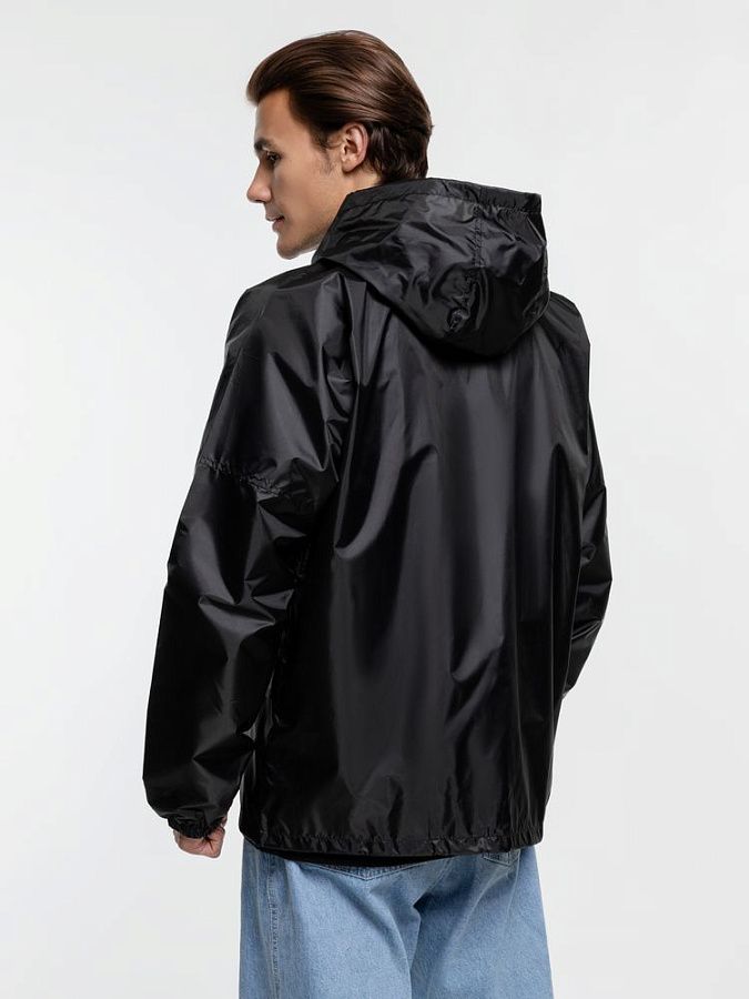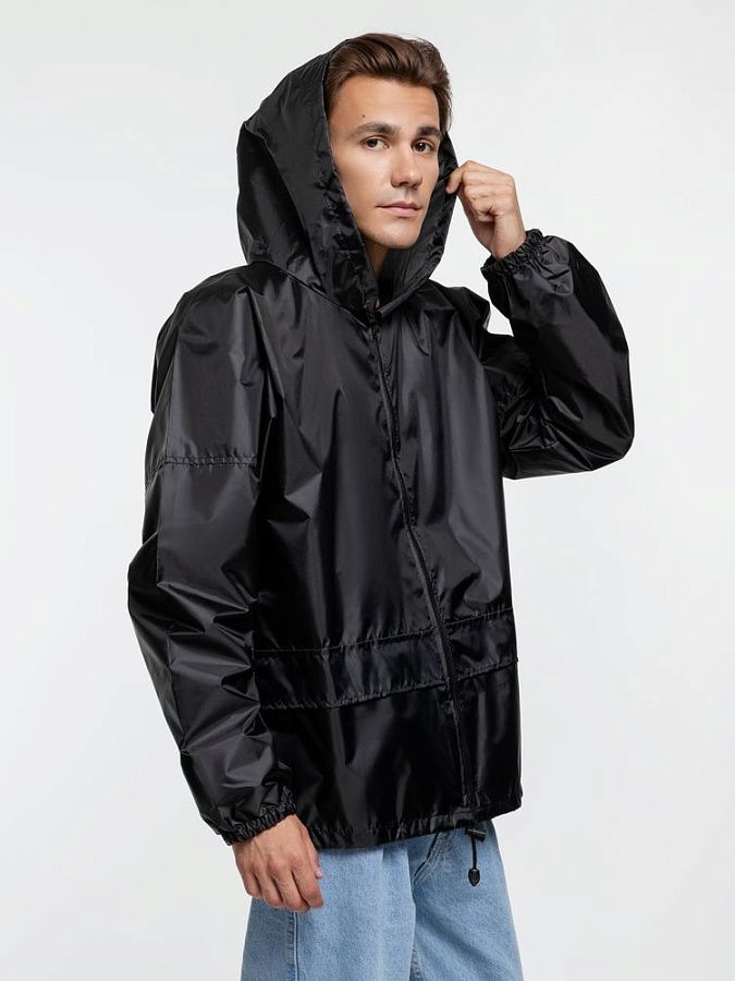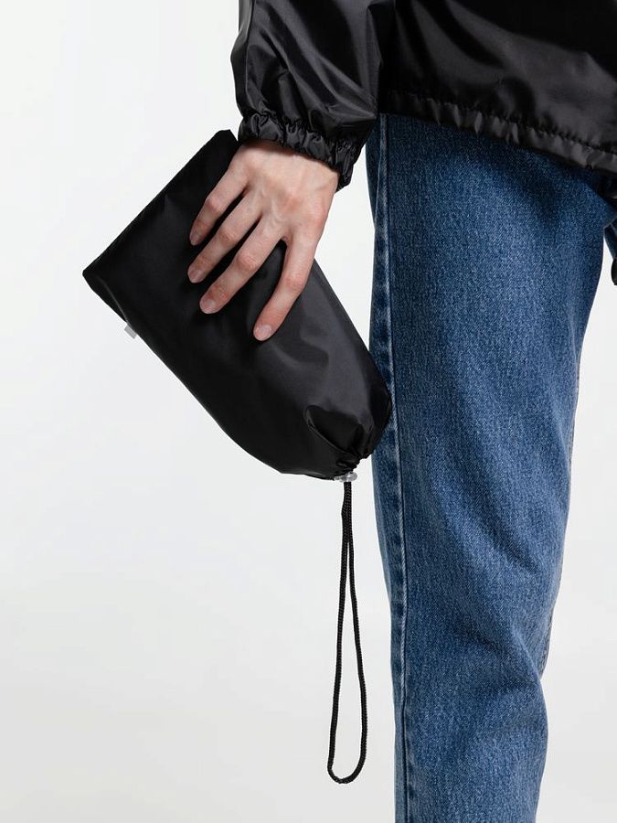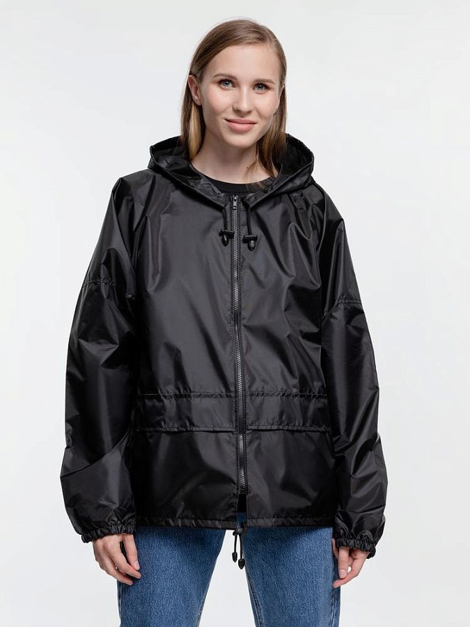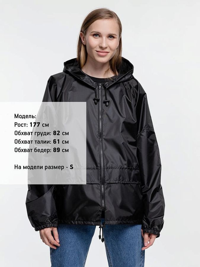Укороченный дождевик свободного кроя из ткани таффета с влагозащитным покрытием. Складывается в мешочек — удобно брать с собой.