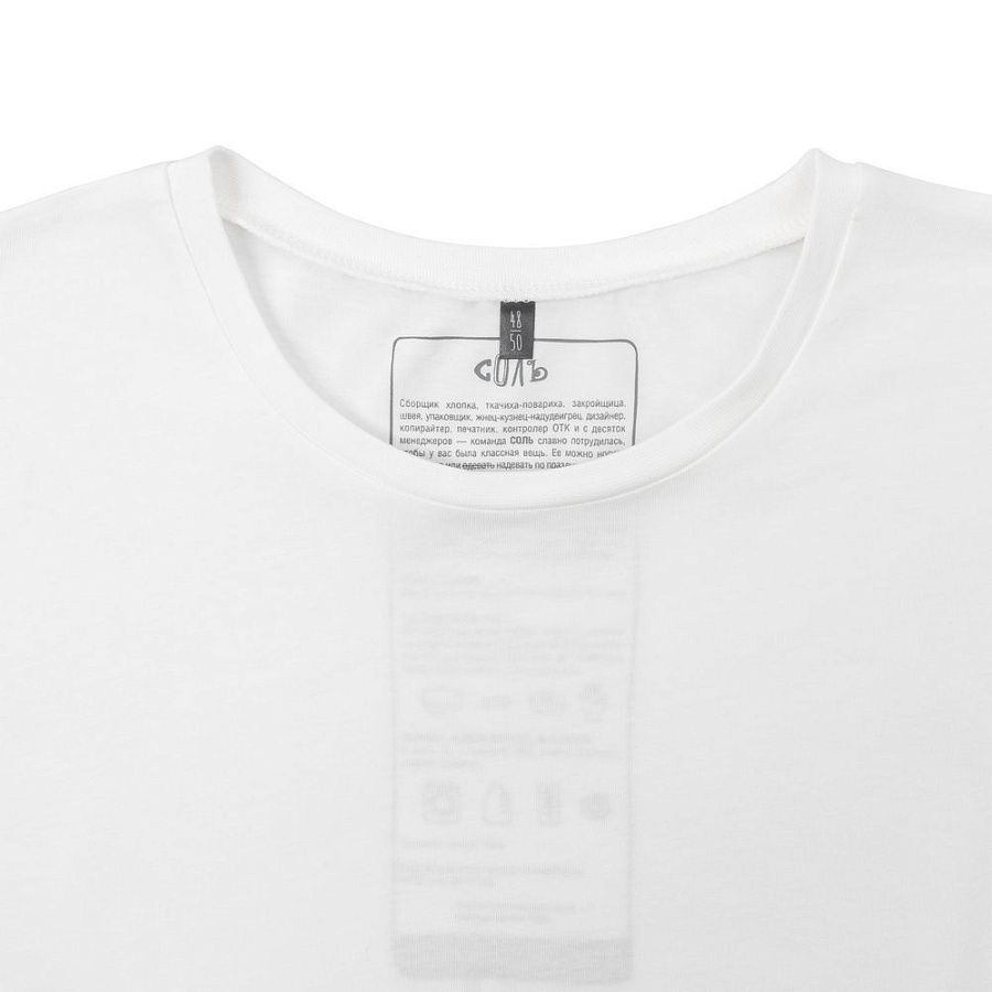 На изнаночной стороне футболки напечатан принт с информацией о бренде и инструкцией по уходу за изделием.