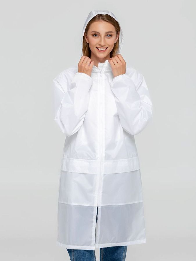 Плащ–дождевик на молнии с капюшоном и рукавами реглан. Ветрозащитные манжеты на рукавах.