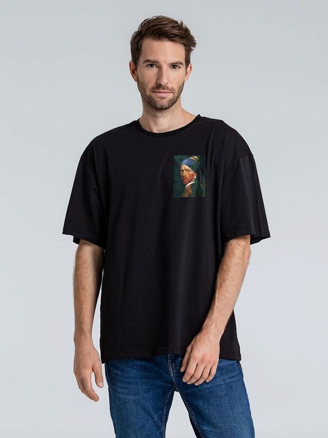 Футболка унисекс со спущенным плечом и круглым вырезом, отделанным резинкой.