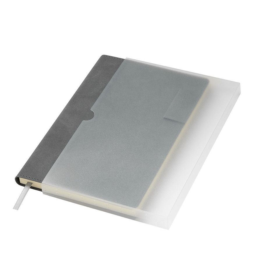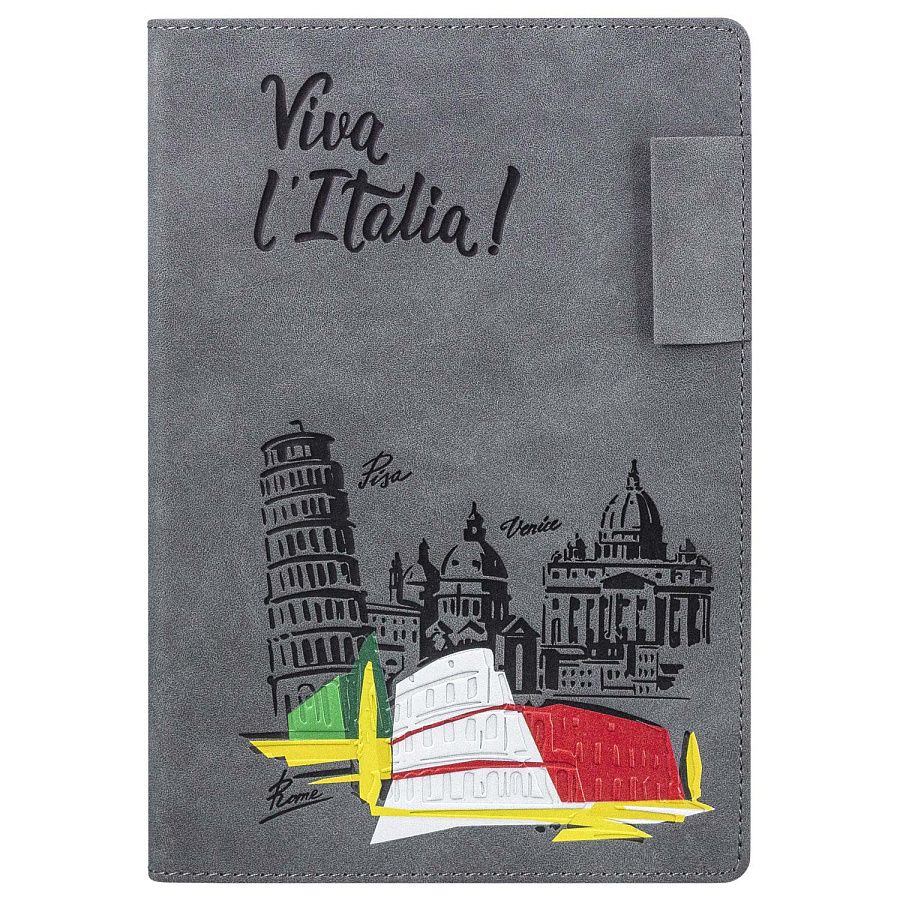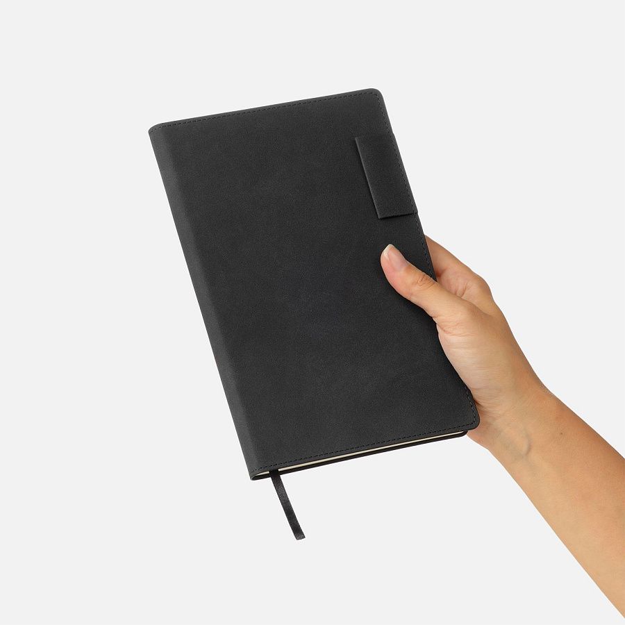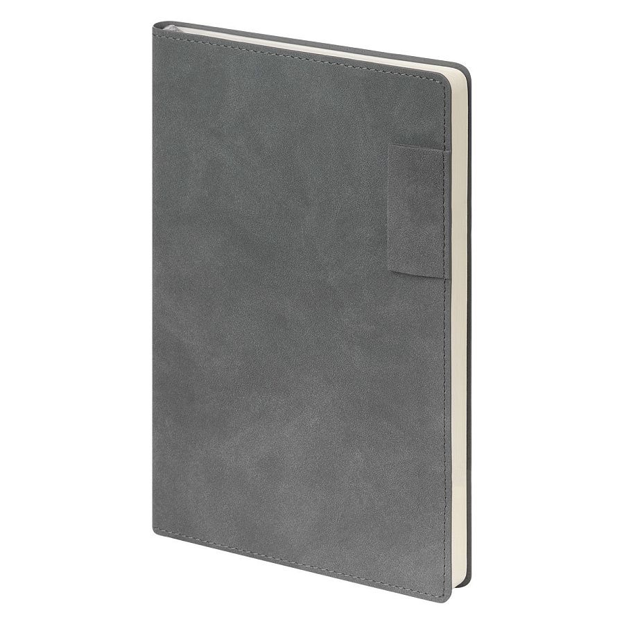 Мягкий на ощупь материал с мелкими вкраплениями имитирует натуральную замшу, а петелька для ручки добавляет практичности. Сдержанные оттенки обложки, форзаца и нахзаца гармонично сочетаются между собой.