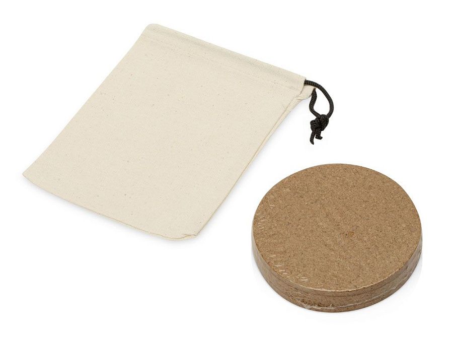 В набор входит 4 костера, упакованных в хлопковый мешочек на шнурке. И подставки, и упаковка набора выполнены из натуральных материалов, более того, хлопок для мешочка используется неокрашенный, что сокращает расход химикатов при создании ткани.