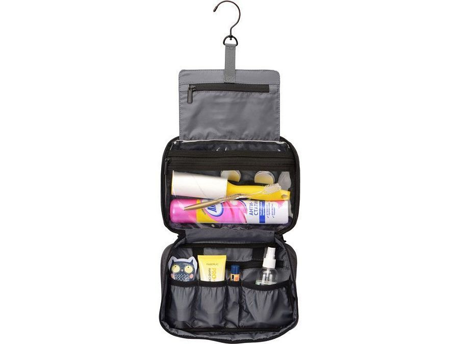 Несессер раскладывается как книжка на две створки и дополнительную секцию с металлическим крючком для подвешивания, карманом на молнии и фиксирующей резинкой. Металлический крючок позволяет подвешивать полностью заполненный несессер, поскольку способен выдержать большой вес, кроме того, вешалка проворачивается вокруг своей оси, что позволяет использовать эту модель с рейлами или в шкафу. Центральная секция имеет прозрачное большое отделение на молнии из ПВХ, внутри которого — три фиксирующих резинки для флаконов или иных принадлежностей. Благодаря выбранному материалу это отделение легко можно протереть влажной салфеткой, если содержимое бутылочки с шампунем или иной косметикой протекло. Вторая створка состоит из большого плоского кармана на молнии, двух резинок, которые подойдут для фиксации зубной щетки, двух узких и двух квадратных карманов.