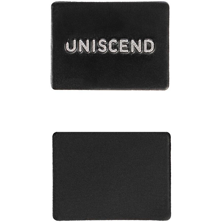 В комплекте идут два самоклеящихся металлических шильдика: стандартный — с брендом Uniscend и чистый — под персональную гравировку.