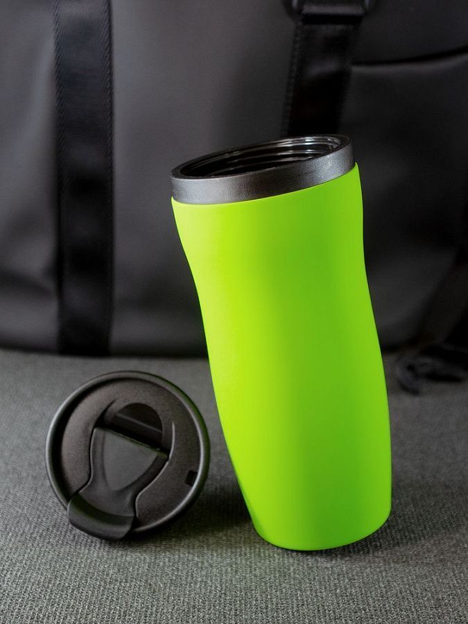 Двухслойная конструкция из нержавеющей стали снаружи и пищевого пластика внутри. Герметичная завинчивающаяся крышка с откидным клапаном для питья. Покрытие софт-тач. В отверстие в крышке можно вставить шнурок для удобного ношения стакана на руке. Шнурок в комплект не входит.