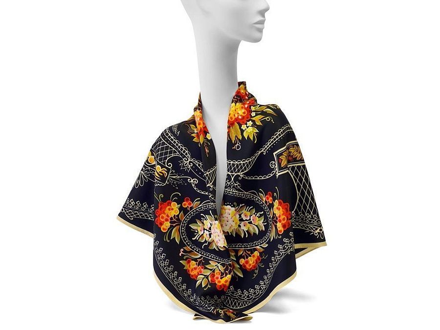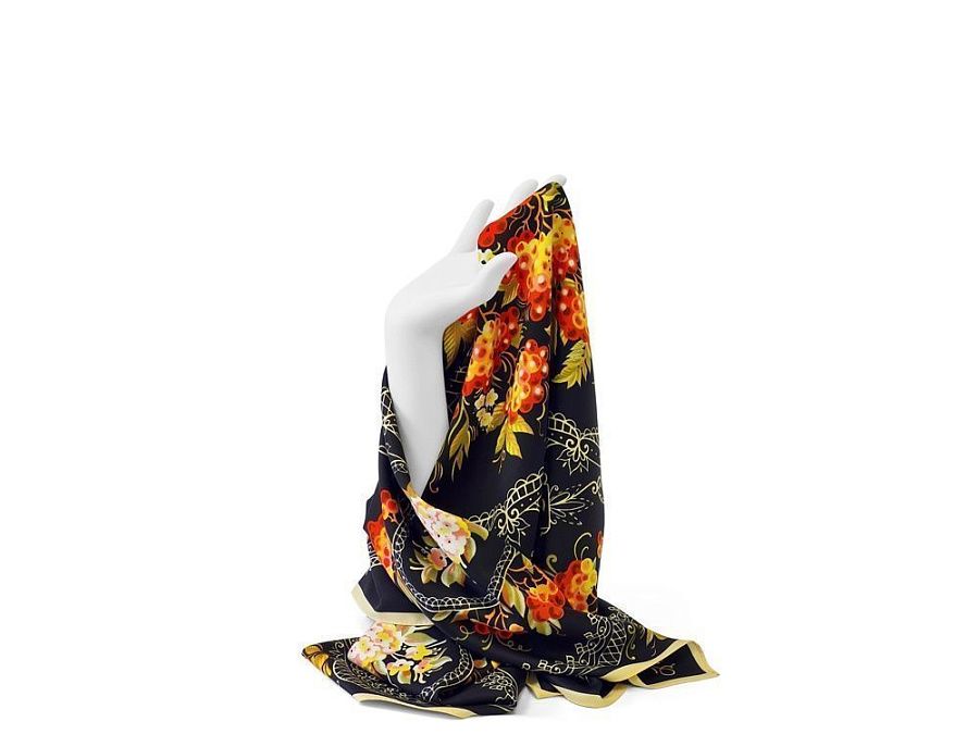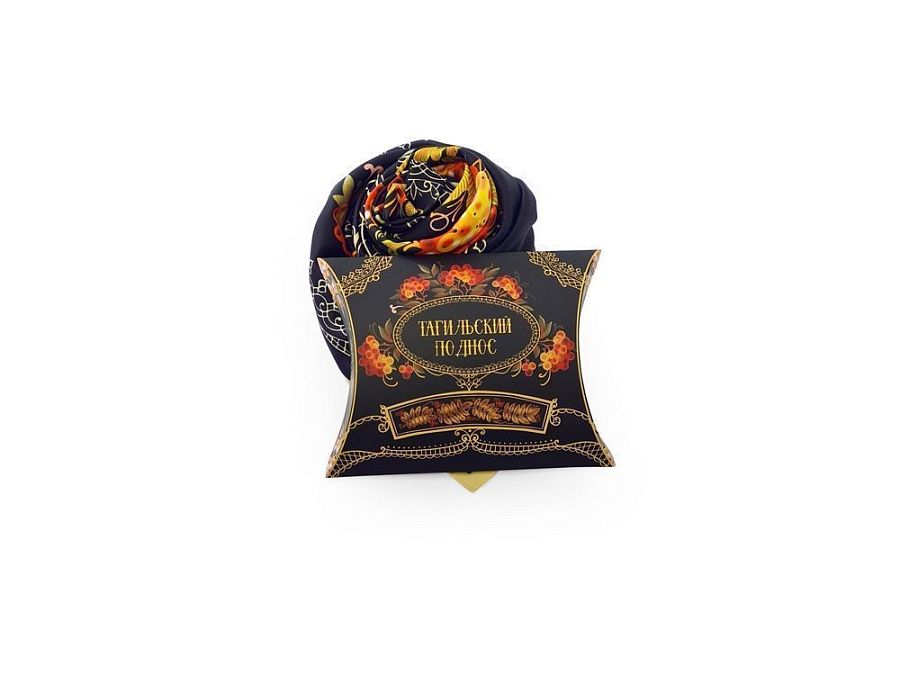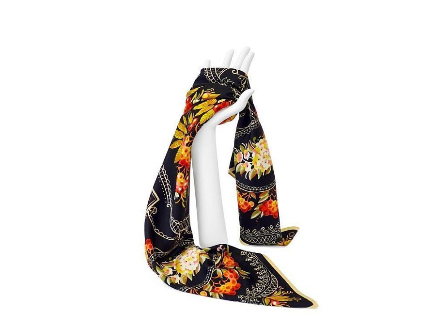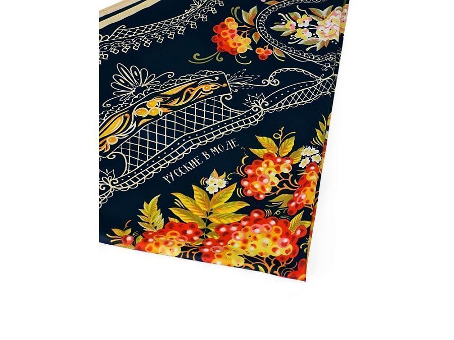 Платок «Тагильский поднос» станет ярким акцентом в вашем гардеробе. Насыщенная терракотово-чёрная цветовая гамма плодов всегда актуальна, а нежные оттенки цветов рябины внесут настроение романтичности и легкости.