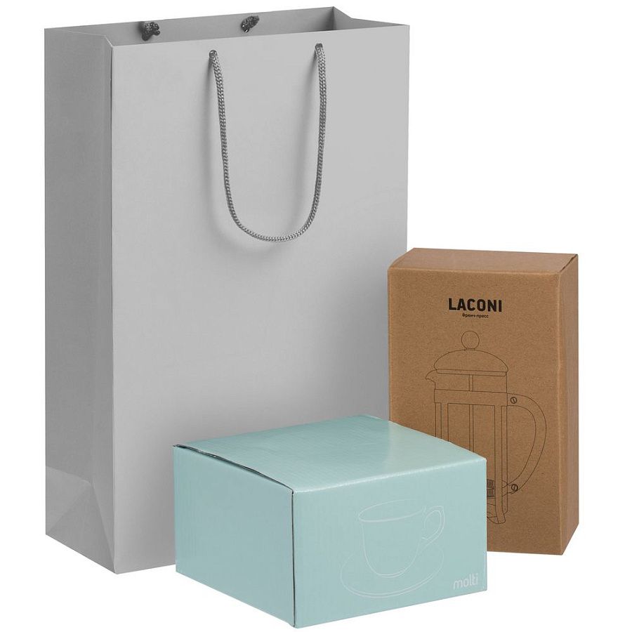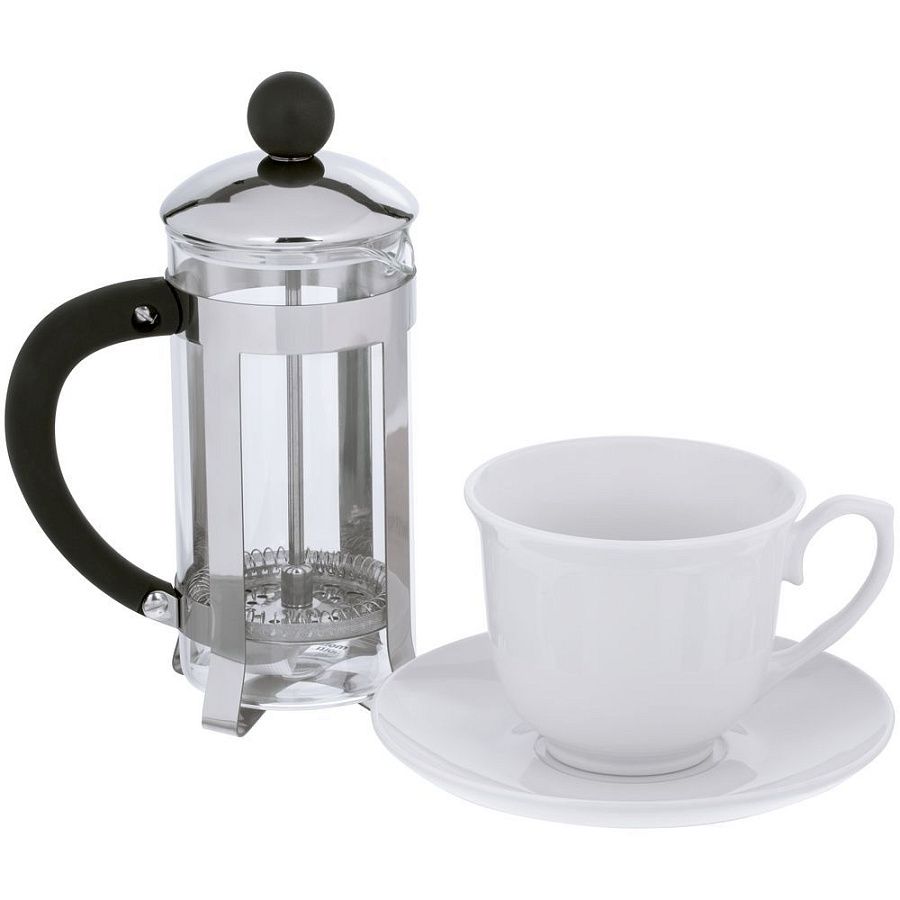 чашка: диаметр 9,2 см, высота 7,5 см; блюдце: 14,5x2 см; френч-пресс: высота 19 см, диаметр 7 см, ширина с ручкой 11,5 см, упаковка 19х12х8,5 см; пакет: 23х35х10 см
