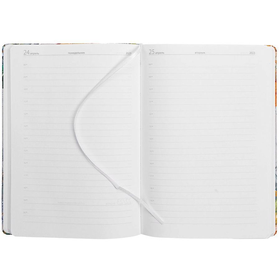 Ежедневник в твердой обложке из картона, дополнен ляссе белого цвета.