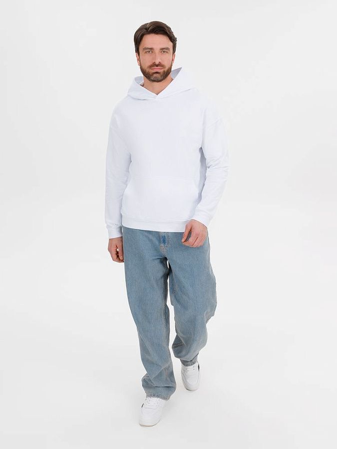 Худи унисекс со спущенным плечом и карманом-кенгуру расслабленного силуэта.