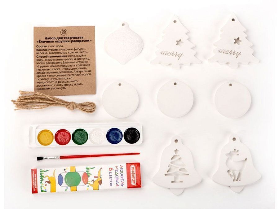 Мы подготовили готовый творческий набор, состоящий из игрушек, выполненных их гипса, кисти и акварельных красок.