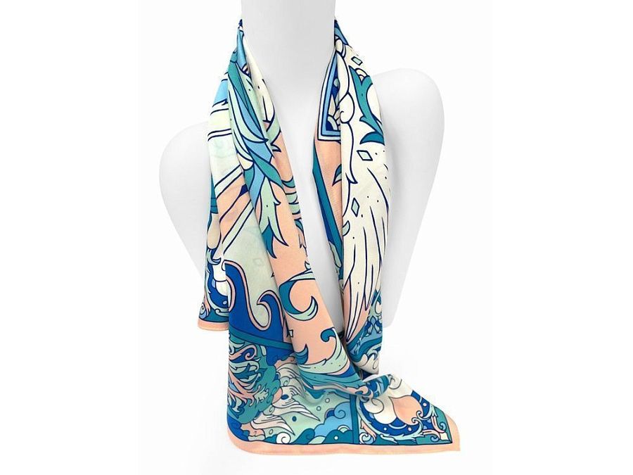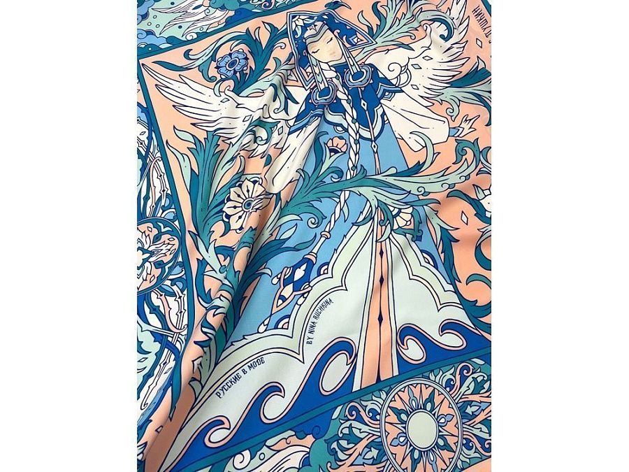 В центре авторского принта — удивительной красоты женщина с белоснежными крыльями, наделенная магическими способностями и житейской мудростью. Оригинальное сочетание тонов, цветочных орнаментов и русского колорита делают аксессуар нежным и самобытным.