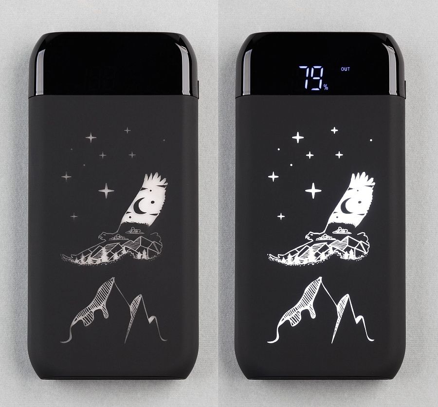 Успех модели обеспечивает сочетание хорошей ёмкости с актуальной функцией беспроводной зарядки и удобным (цифровым) отображением уровня заряда батареи. Эффектное дополнение - яркая персонализация в виде подсветки логотипа + приятный тактильно, бархатистый корпус в покрытии soft touch.