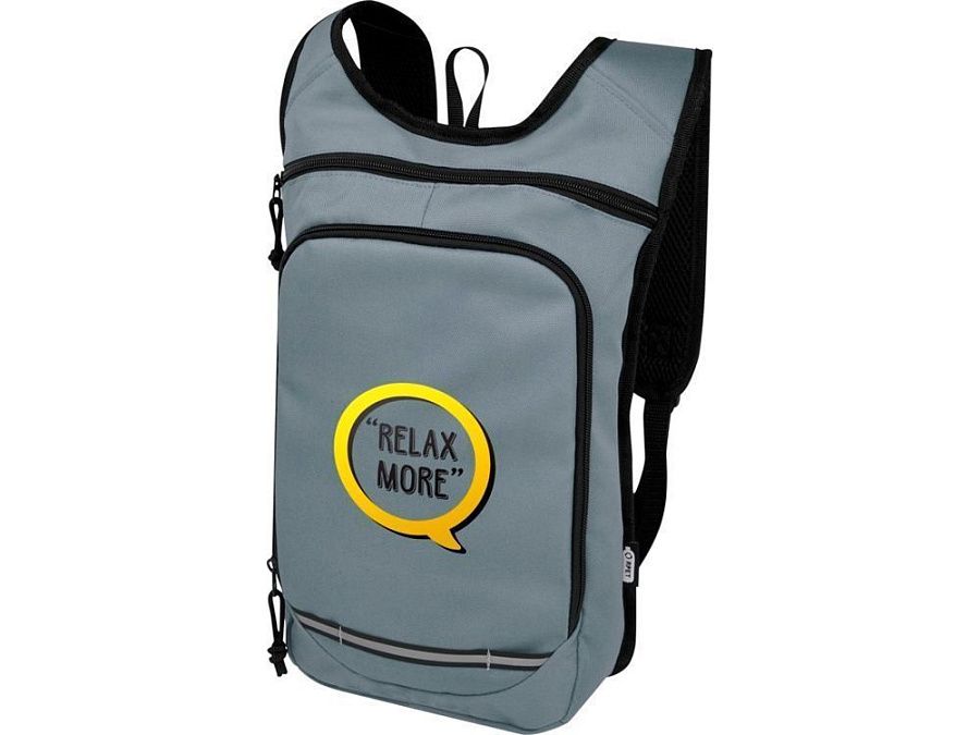 Рюкзак Trails изготовлен из 100% переработанной по стандарту GRS водоотталкивающей ткани и имеет один передний карман на молнии и одно основное отделение на молнии, а также отделение для гидросистемы. Светоотражающие полосы для видимости и сетчатая задняя часть для комфорта при переноске делает его отличным экологичным выбором для активного отдыха.