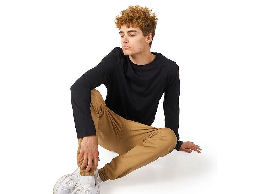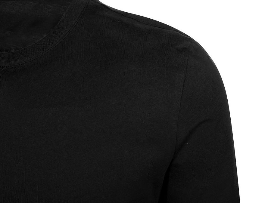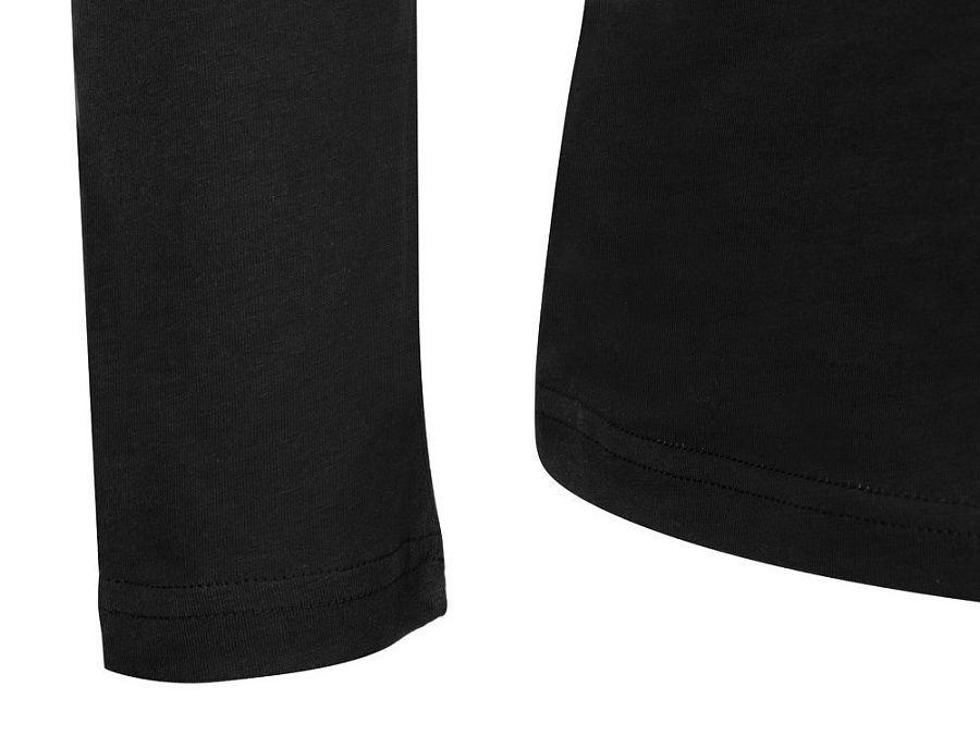 Футболка с длинным рукавом комфортной посадки с боковыми швами. Горловина обработана рибом 1х1 и тесьмой по спинке. Футболка выполнена из хлопкового джерси.