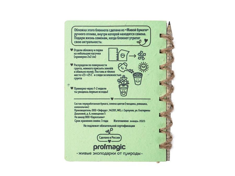 «Живой Блокнот» - это блокнот ручной работы с семенами гвоздики, ромашки и колокольчика внутри обложки. Блок на 50 листов сделан из экологичной неотбеленной бумаги, вместо пружины используется льняной шпагат. Блокнот поставляется с бумажным карандашом в наборе. После использования блокнота, вырвите обложку, порвите ее на кусочки и посадите в землю. Поливайте и уже через несколько недель вы увидите первые всходы.