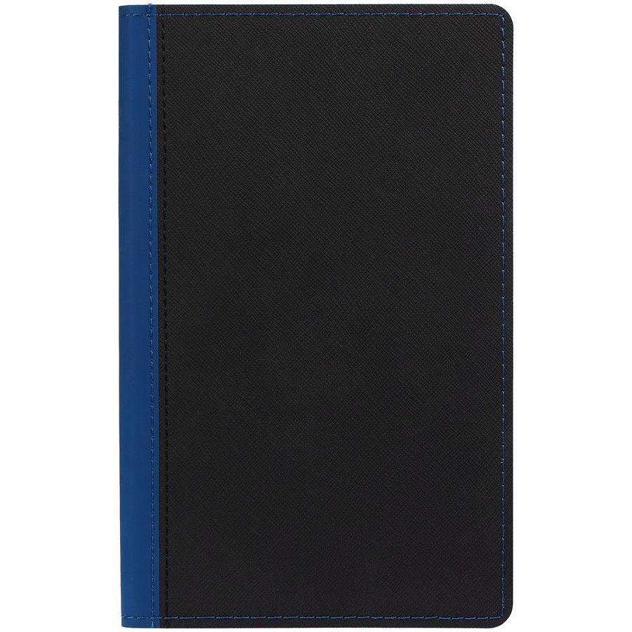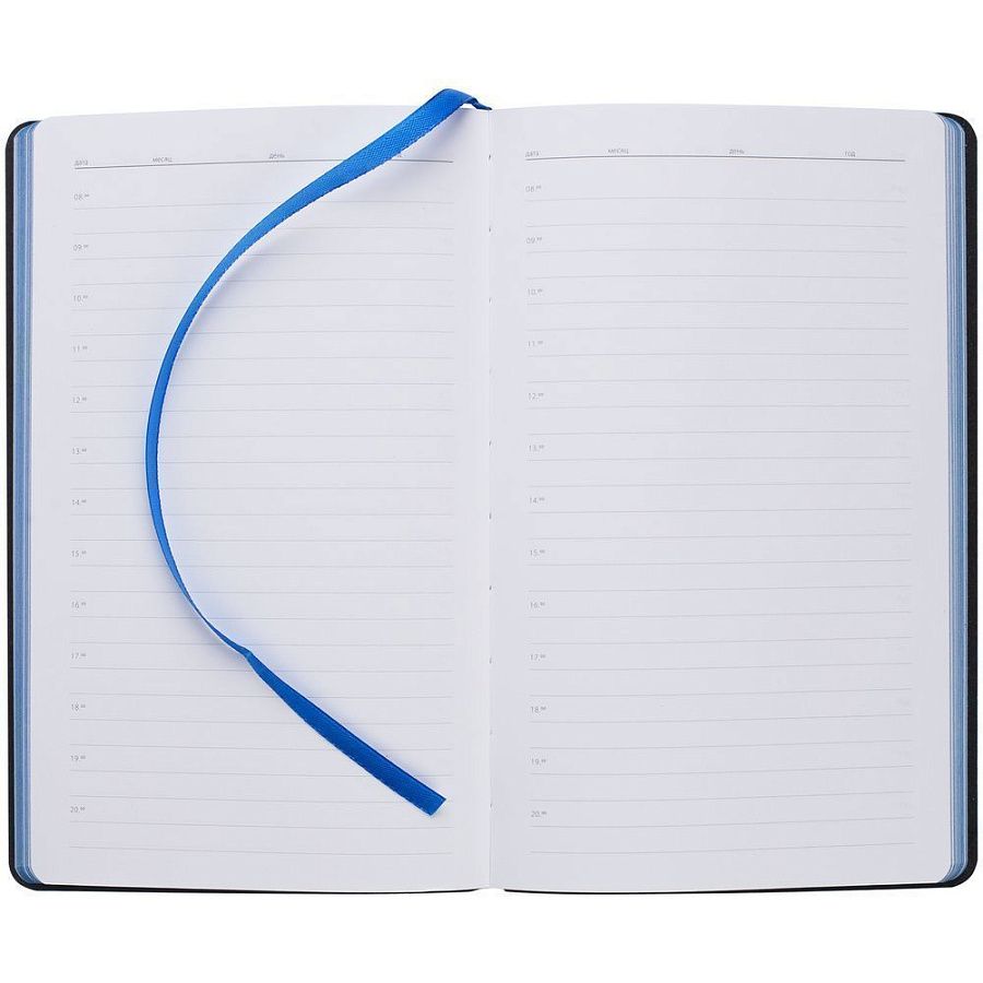 Ежедневник с гибкой обложкой выполнен из материала Nice Touch, черный АА и Soft Touch Ultra, синий НН, дополнен ляссе гсинего цвета.